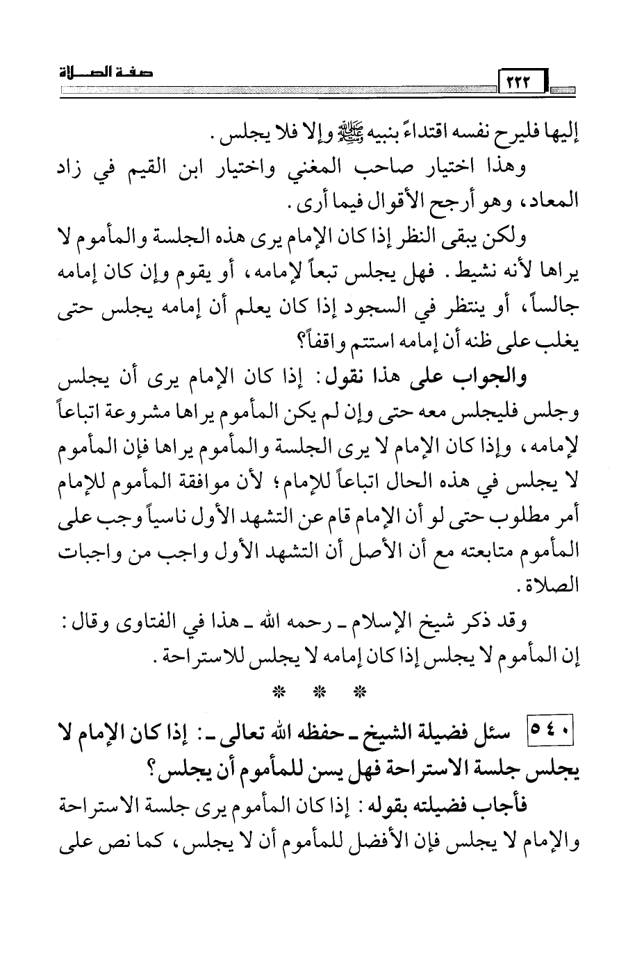 540 سئل فضيلة الشيخ – حفظه الله تعالى -: إذا كان الإمام لا يجلس جلسة الاستراحة فهل يسن للمأموم أن يجلس؟