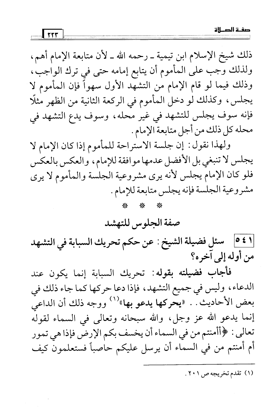 فأجاب فضيلته بقوله: تحريك السبابة إنما يكون عند الدعاء، وليس في جميع التشهد، فإذا دعى حركها كما جاء ذلك في بعض الأحاديث.. "يحركها يدعو بها" (¬1) ووجه ذلك أن الداعي إنما يدعو الله عز وجل، والله سبحانه وتعالى في السماء لقوله تعالى: (أَأَمِنْتُمْ مَنْ فِي السَّمَاءِ أَنْ يَخْسِفَ بِكُمُ الْأَرْضَ فَإِذَا هِيَ تَمُورُ* أَمْ أَمِنْتُمْ مَنْ فِي السَّمَاءِ أَنْ يُرْسِلَ عَلَيْكُمْ حَاصِباً فَسَتَعْلَمُونَ كَيْفَ