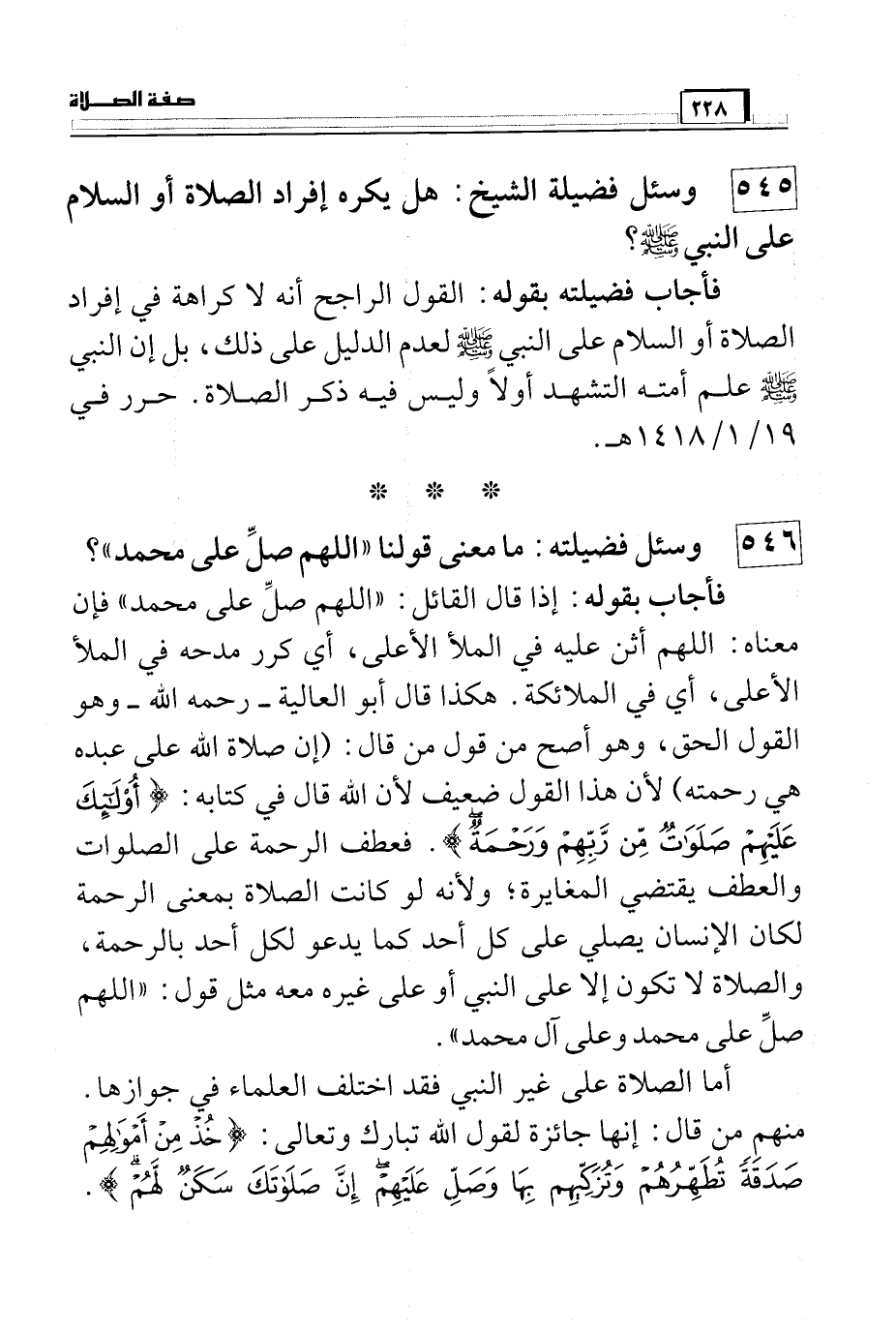 545 وسئل فضيلة الشيخ: هل يكره إفراد الصلاة أو السلام على النبي صَلَّى اللَّهُ عَلَيْهِ وَسَلَّمَ؟