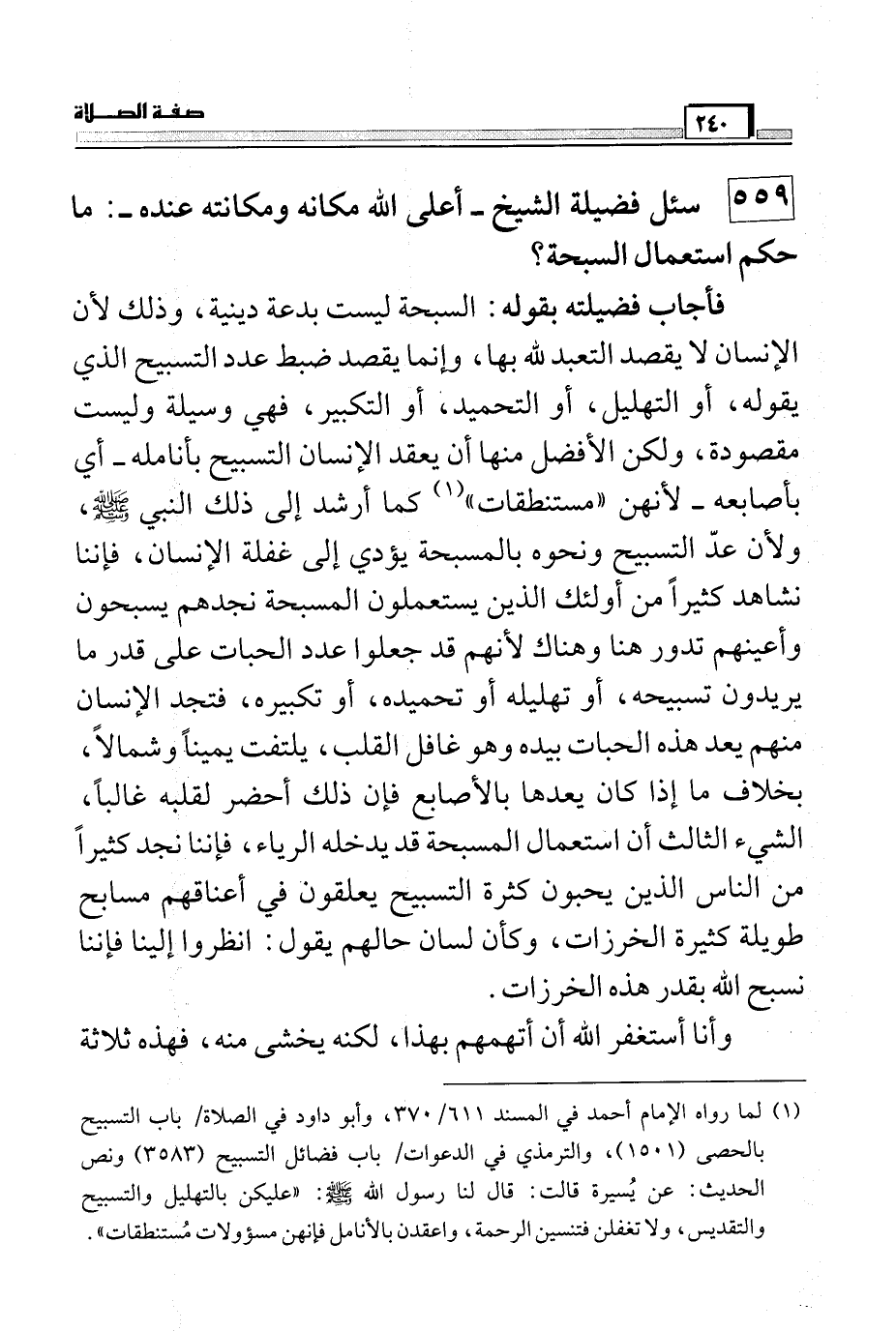 559 سئل فضيلة الشيخ - أعلى الله مكانه ومكانته عنده -: ما حكم استعمال السبحة؟