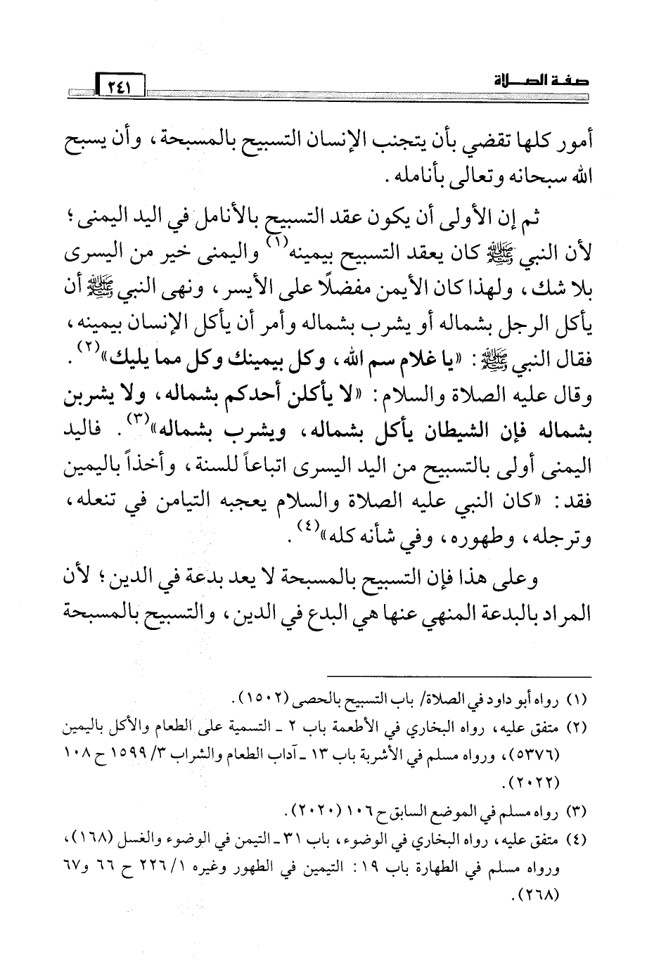 ثم أن الأولى أن يكون عقد التسبيح بالأنامل في اليد اليمنى؛ لأن النبي صَلَّى اللَّهُ عَلَيْهِ وَسَلَّمَ كان يعقد التسبيح بيمينه (¬1) واليمنى خير من اليسرى بلا شك، ولهذا كان الأيمن مفضلاً على الأيسر، ونهى النبي صَلَّى اللَّهُ عَلَيْهِ وَسَلَّمَ أن يأكل الرجل بشماله أو يشرب بشماله وأمر أن يأكل الإنسان بيمينه، فقال النبي صَلَّى اللَّهُ عَلَيْهِ وَسَلَّمَ: "يا غلام سم الله، وكل بيمينك وكل مما يليك" (¬2) . وقال عليه الصلاة والسلام: "لا يأكلن أحدكم بشماله، ولا يشربن بشماله فإن الشيطان يأكل بشماله، ويشرب بشماله" (¬3) . فاليد اليمنى أولى بالتسبيح من اليد اليسرى اتباعاً للسنة، وأخذاً باليمين فقد: "كان النبي عليه الصلاة والسلام يعجبه التيامن في تنعله، وترجله، وطهوره، وفي شأنه كله" (¬4) .