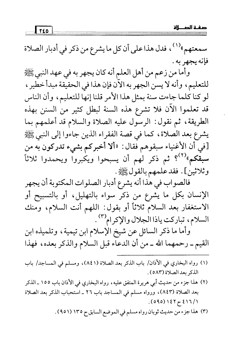 وأما من زعم من أهل العلم أنه كان يجهر به في عهد النبي صَلَّى اللَّهُ عَلَيْهِ وَسَلَّمَ للتعليم، وأنه لا يسن الجهر به الآن فإن هذا في الحقيقة مبدأ خطير، لو كنا كلما جاءت سنة بمثل هذا الأمر قلنا إنها للتعليم، وأن الناس قد تعلموا الآن فلا تشرع هذه السنة لبطل كثير من السنن بهذه الطريقة، ثم نقول: الرسول عليه الصلاة والسلام قد أعلمهم بما يشرع بعد الصلاة، كما في قصة الفقراء الذين جاءوا إلى النبي صَلَّى اللَّهُ عَلَيْهِ وَسَلَّمَ [في أن الأغنياء سبقوهم فقال: "ألا أخبركم بشيء تدركون به من سبقكم" (¬2) ؟ ثم ذكر لهم أن يسبحوا ويكبروا ويحمدوا ثلاثاً وثلاثين] . فقد علمهم بالقول صَلَّى اللَّهُ عَلَيْهِ وَسَلَّمَ.