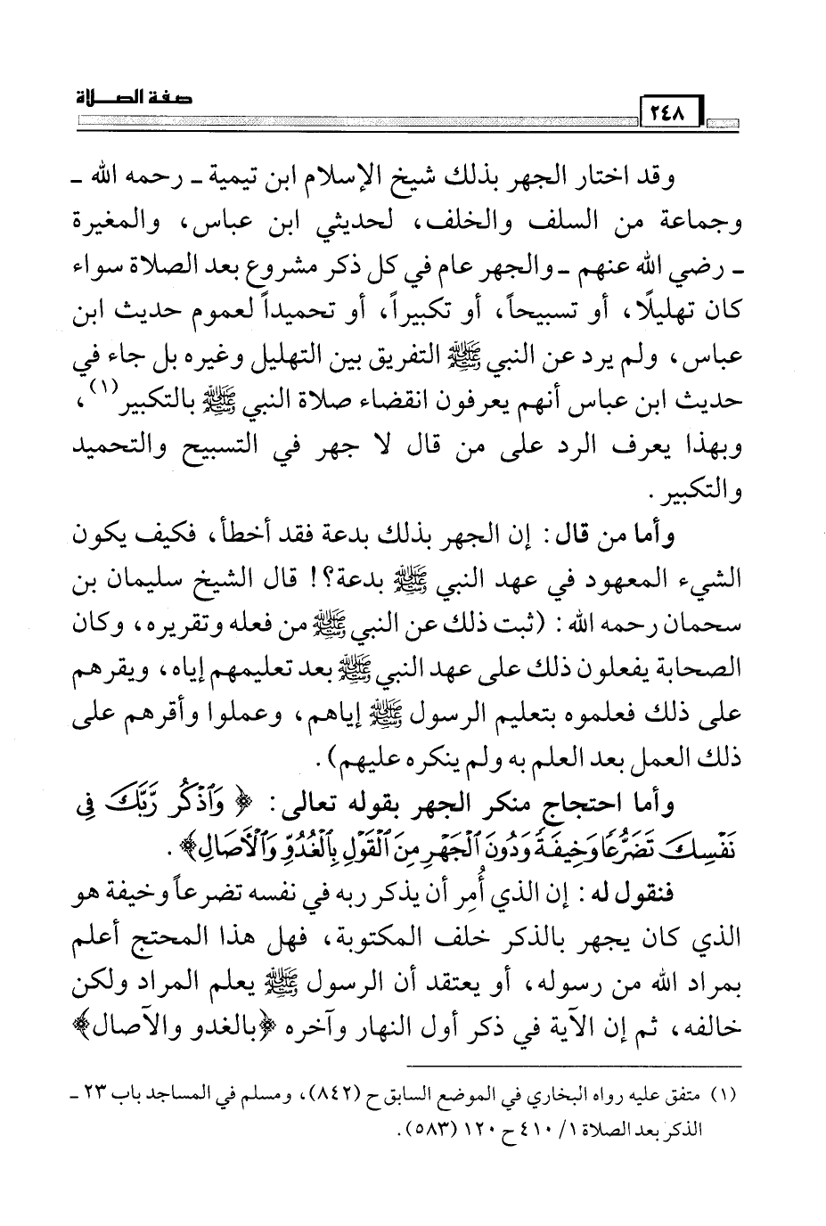 فنقول له: إن الذي أمر أن يذكر ربه في نفسه تضرعاً وخيفة هو الذي كان يجهر بالذكر خلف المكتوبة، فهل هذا المحتج أعلم بمراد الله من رسوله، أو يعتقد أن الرسول صَلَّى اللَّهُ عَلَيْهِ وَسَلَّمَ يعلم المراد ولكن خالفه، ثم إن الآية في ذكر أول النهار وآخره (بِالْغُدُوِّ وَالْآصَالِ)