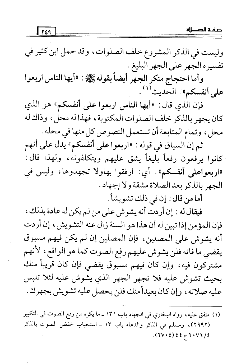 ثم إن السياق في قوله: "اربعوا على أنفسكم" يدل على أنهم كانوا يرفعون رفعاً بليغاً يشق عليهم ويتكلفونه، ولهذا قال: "أربعوا على أنفسكم". أي: ارفقوا بها ولا تجهدوها، وليس في الجهر بالذكر بعد الصلاة مشقة ولا إجهاد.