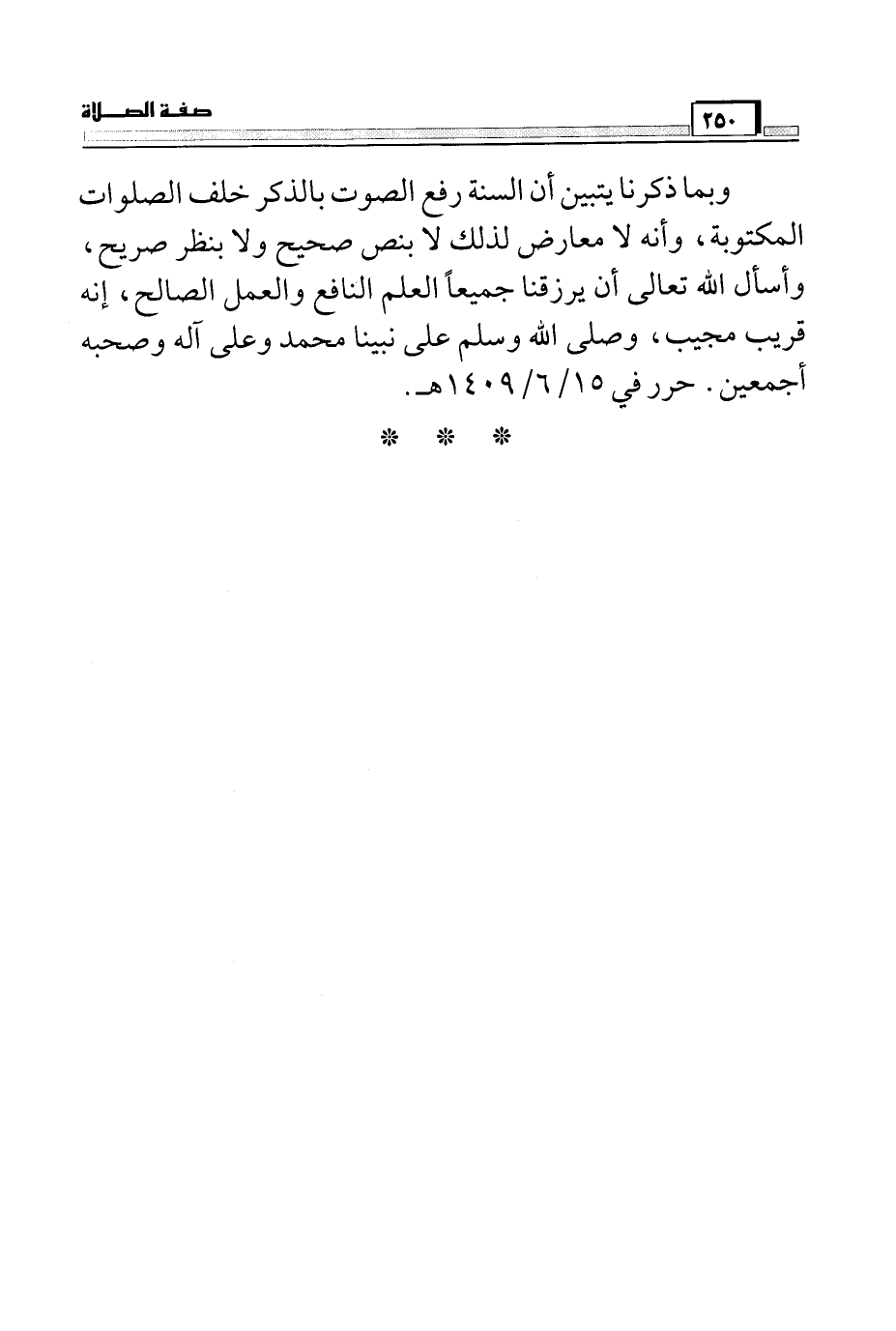 وبما ذكرنا يتبين أن السنة رفع الصوت بالذكر خلف الصلوات المكتوبة، وأنه لا معارض لذلك لا بنص صحيح ولا بنظر صريح، وأسأل الله تعالى أن يرزقنا جميعاً العلم النافع والعمل الصالح، إنه قريب مجيب، وصلى الله وسلم على نبينا محمد وعلى آله وصحبه أجمعين. حرر في 15/6/1409هـ.