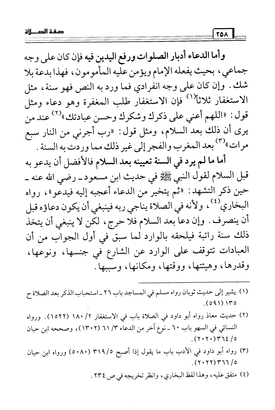 وأما الدعاء أدبار الصلوات ورفع اليدين فيه فإن كان على وجه جماعي، بحيث يفعله الإمام ويؤمن عليه المأمومون، فهذا بدعة بلا شك. وإن كان على وجه انفرادي فما ورد به النص فهو سنة، مثل الاستغفار ثلاثاً (¬1) فإن الاستغفار طلب المغفرة وهو دعاء ومثل قول: "اللهم أعني على ذكرك وشكرك وحسن عبادتك" (¬2) عند من يرى أن ذلك بعد السلام، ومثل قول: "رب أجرني من النار سبع مرات" (¬3) بعد المغرب والفجر إلى غير ذلك مما وردت به السنة.