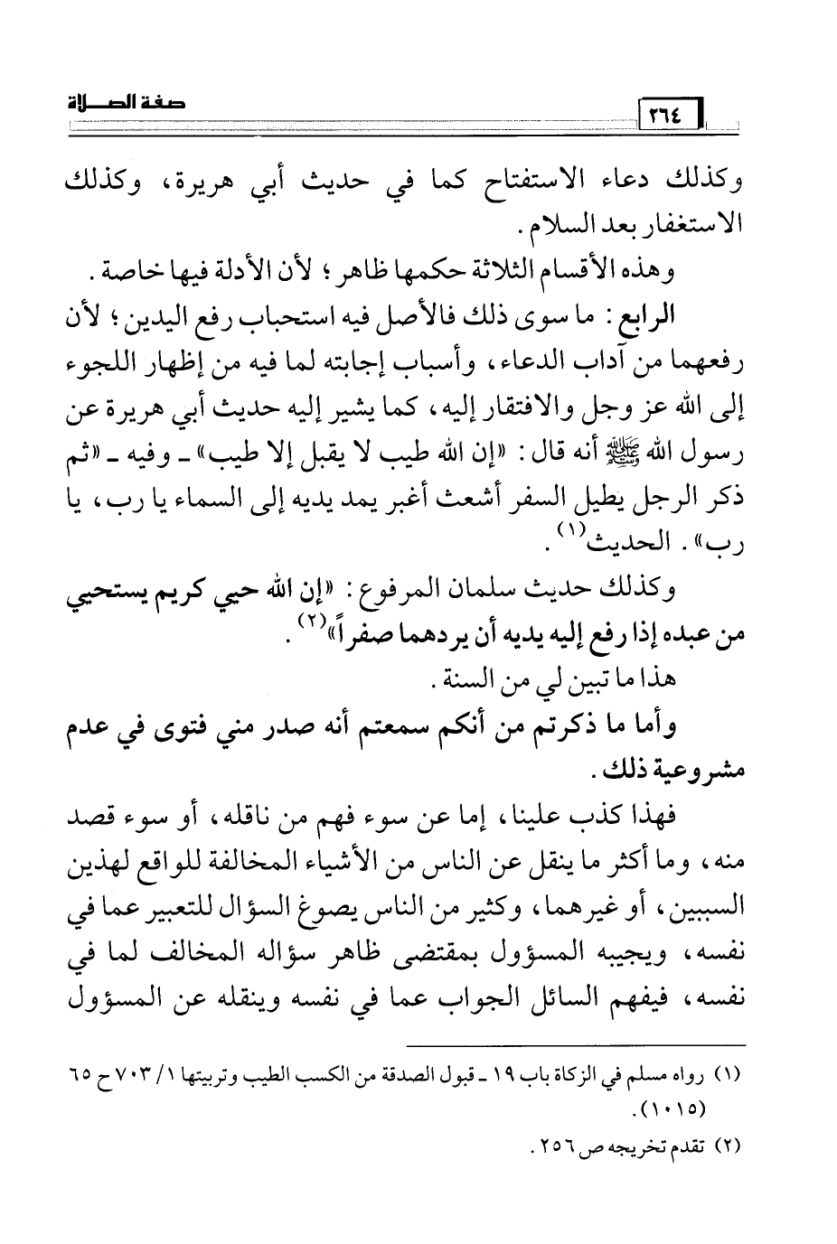 الرابع: ما سوى ذلك فالأصل فيه استحباب رفع اليدين؛ لأن رفعهما من آداب الدعاء، وأسباب أجابته لما فيه من إظهار اللجوء إلى الله عز وجل والافتقار إليه، كما يشير إليه حديث أبي هريرة عن رسول الله صَلَّى اللَّهُ عَلَيْهِ وَسَلَّمَ أنه قال: "إن الله طيب لا يقبل إلا طيب" وفيه "ثم ذكر الرجل يطيل السفر أشعث أغبر يمد يديه إلى السماء يا رب، يا رب". الحديث (¬1) .