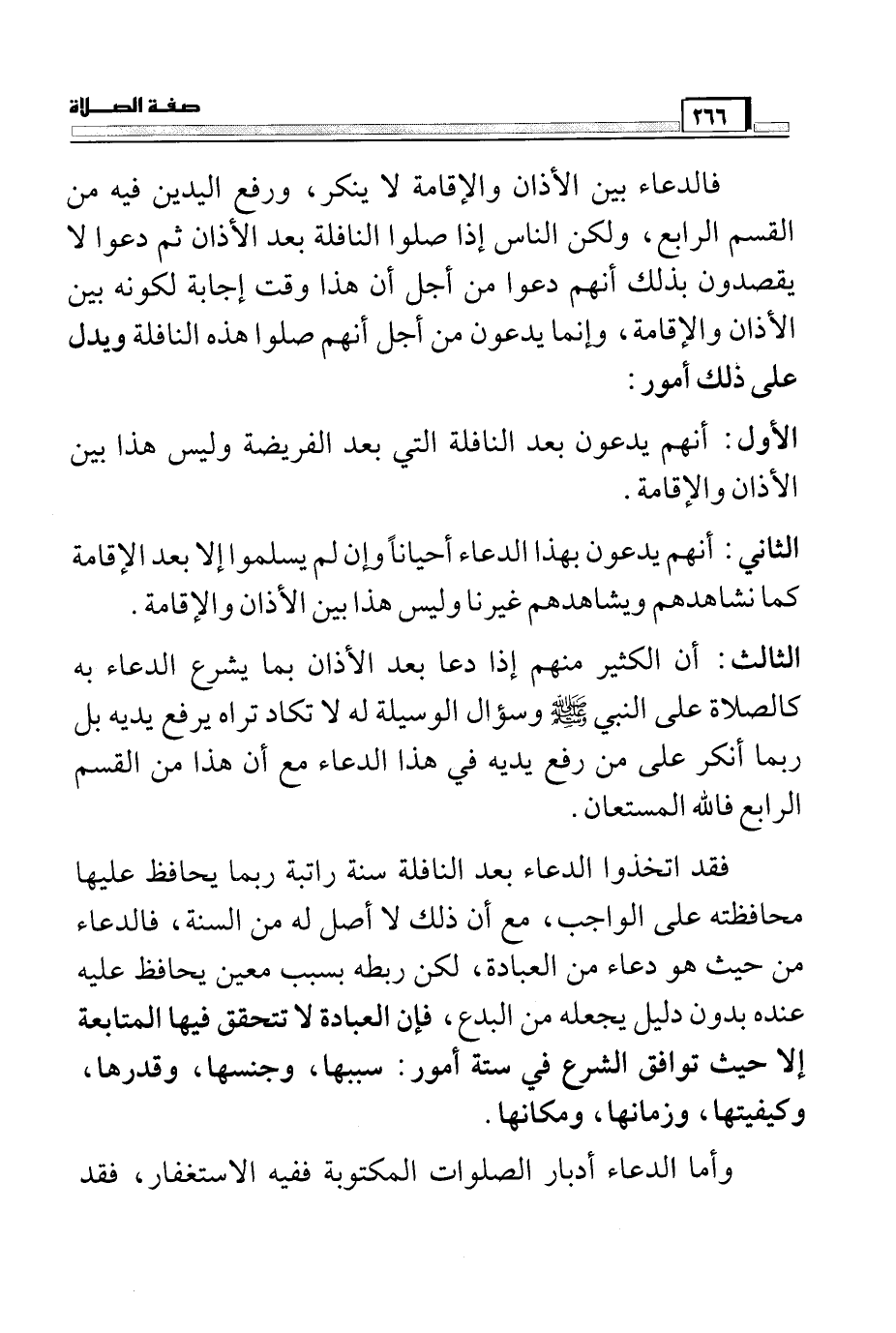 فقد اتخذوا الدعاء بعد النافلة سنة راتبة ربما يحافظ عليها محافظته على الواجب، مع أن ذلك لا أصل له من السنة، فالدعاء من حيث هو دعاء من العبادة، لكن ربطه بسبب معين يحافظ عليه عنده بدون دليل يجعله من البدع، فإن العبادة لا تتحقق فيها المتابعة إلا حيث توافق الشرع في ستة أمور: سببها، وجنسها، وقدرها، وكيفيتها، وزمانها، ومكانها.