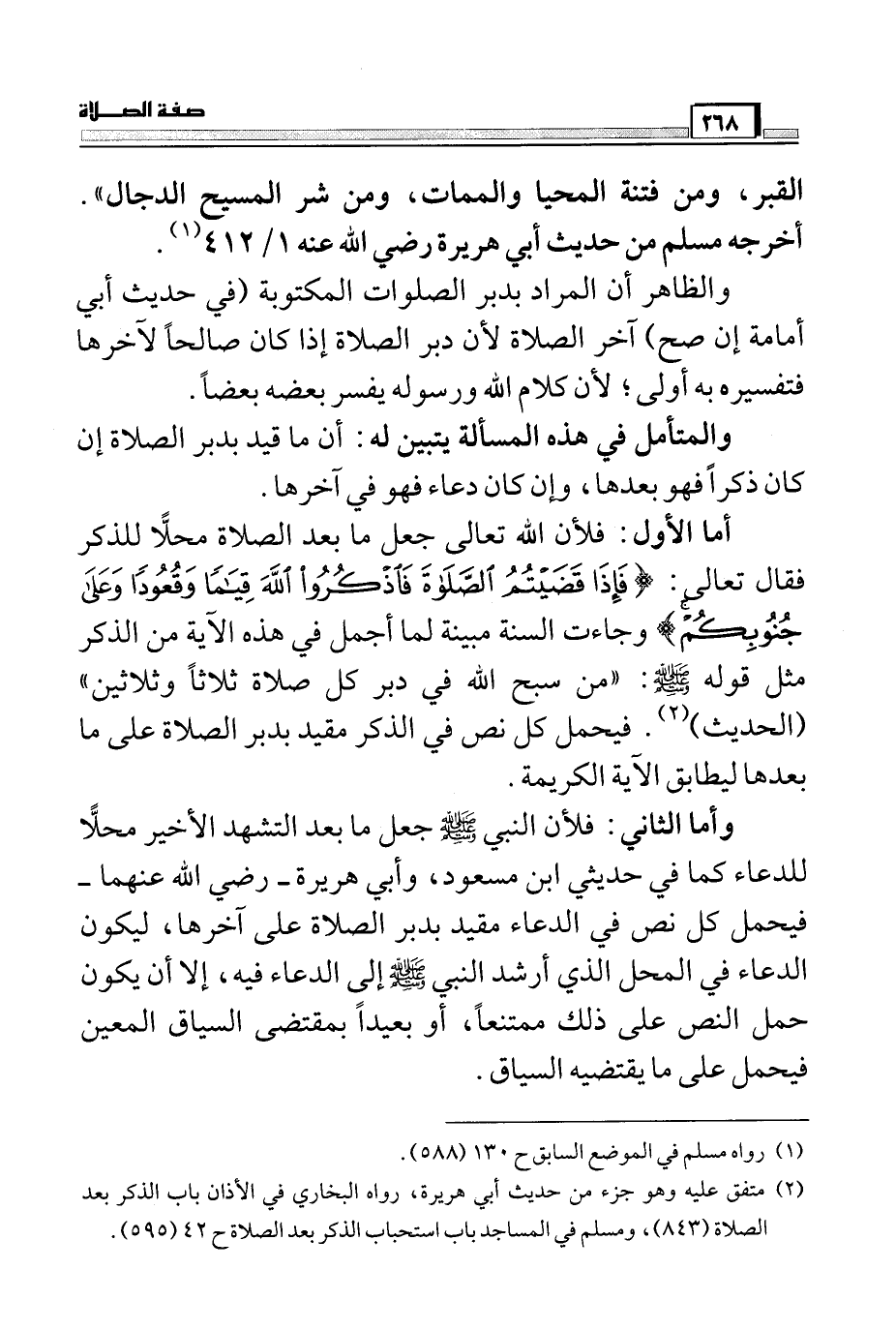 أما الأول: فلأن الله تعالى جعل ما بعد الصلاة محلاً للذكر فقال تعالى: (فَإِذَا قَضَيْتُمُ الصَّلاةَ فَاذْكُرُوا اللَّهَ قِيَاماً وَقُعُوداً وَعَلَى جُنُوبِكُم) وجاءت السنة مبينة لما أجمل في هذه الآية من الذكر مثل قوله صَلَّى اللَّهُ عَلَيْهِ وَسَلَّمَ: "من سبح الله في دبر كل صلاة ثلاثاً وثلاثين" (الحديث) (¬2) . فيحمل كل نص في الذكر مقيد بدبر الصلاة على ما بعدها ليطابق الآية الكريمة.