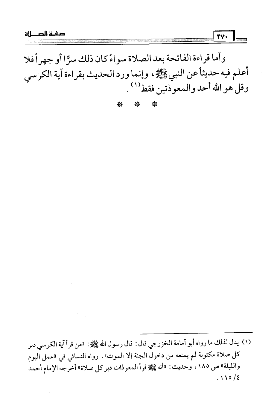 (¬1) يدل لذلك ما رواه أبو أمامة الخزرجي قال: قال رسول الله صَلَّى اللَّهُ عَلَيْهِ وَسَلَّمَ: "من قرأ آية الكرسي دبر كل صلاة مكتوبة لم يمنعه من دخول الجنة إلا الموت". رواه النسائي في "عمل اليوم والليلة" ص185، وحديث: "أنه صَلَّى اللَّهُ عَلَيْهِ وَسَلَّمَ قرأ المعوذات دبر كل صلاة" أخرجه الإمام أحمد 4/115.