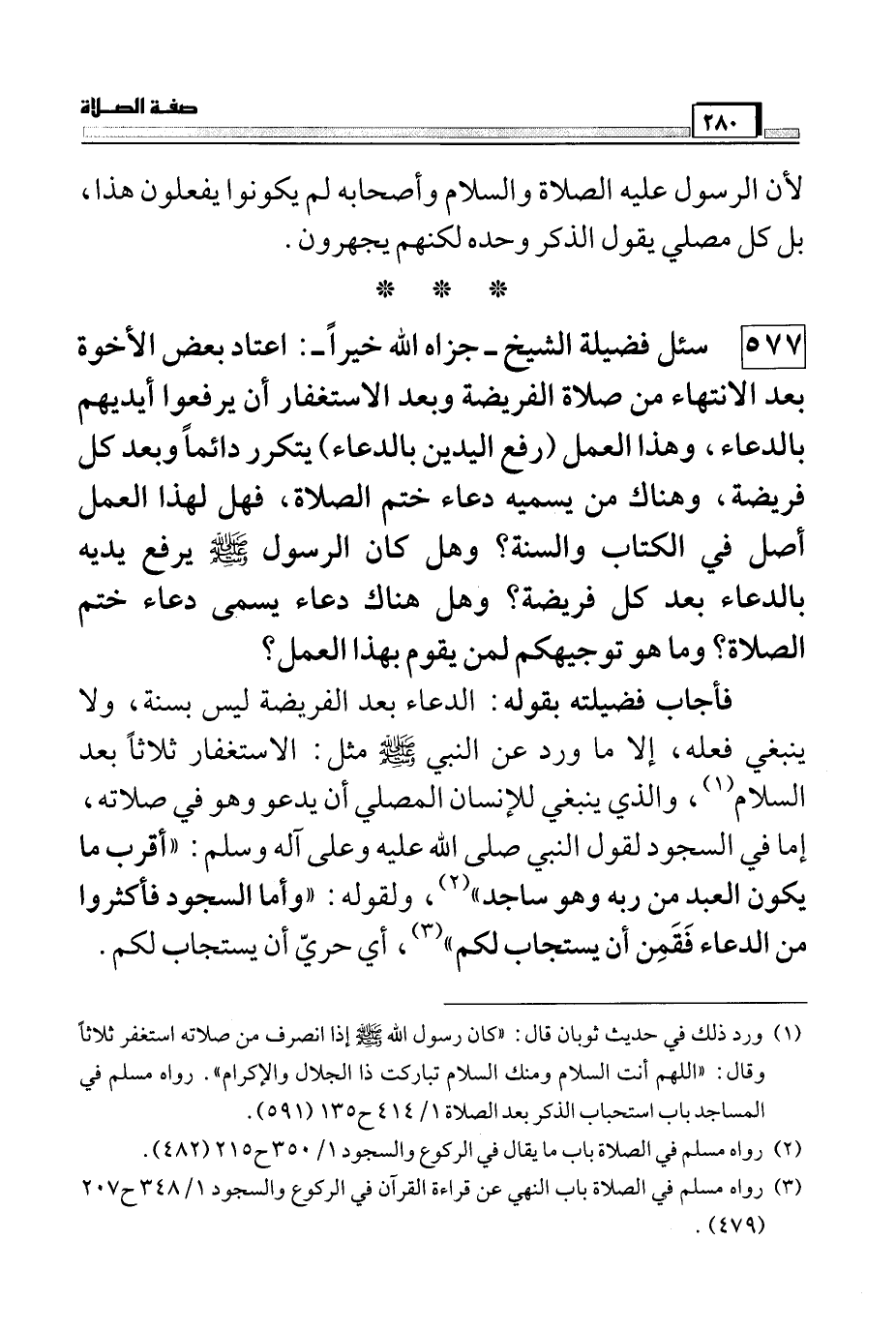 فأجاب فضيلته بقوله: الدعاء بعد الفريضة ليس بسنة، ولا ينبغي فعله، إلا ما ورد عن النبي صَلَّى اللَّهُ عَلَيْهِ وَسَلَّمَ مثل: الاستغفار ثلاثاً بعد السلام (¬1) ، والذي ينبغي للإنسان المصلي أن يدعو وهو في صلاته، إما في السجود لقول النبي صَلَّى اللَّهُ عَلَيْهِ وَسَلَّمَ وعلى آله وسلم: "أقرب ما يكون العبد من ربه وهو ساجد" (¬2) ، ولقوله: "وأما السجود فأكثروا من الدعاء فقمن أن يستجاب لكم" (¬3) ، أي حريّ أن يستجاب لكم.