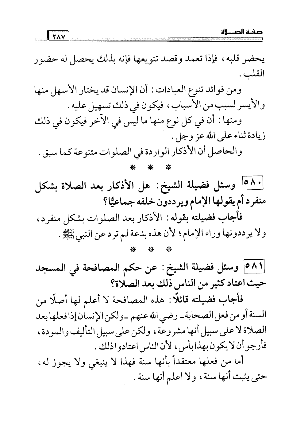 581 وسئل فضيلة الشيخ: عن حكم المصافحة في المسجد حيث اعتاد كثير من الناس ذلك بعد الصلاة؟