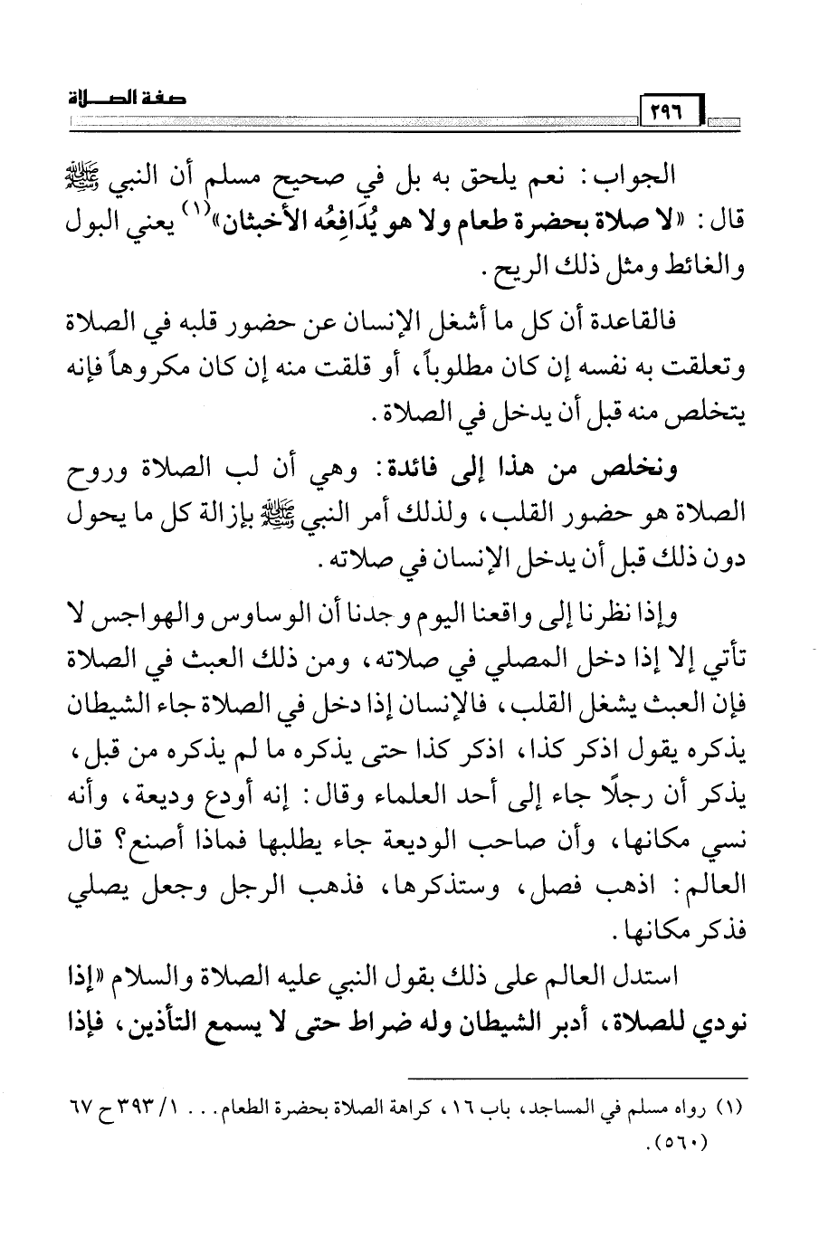 (¬1) رواه مسلم في المساجد، باب 16، كراهة الصلاة بحضرة الطعام 1/393 ح67 (560) .