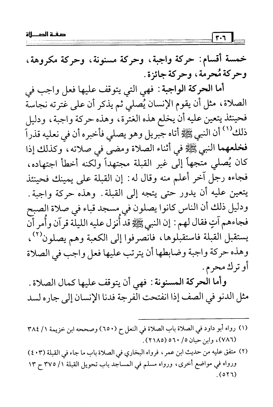 أما الحركة الواجبة: فهي التي يتوقف عليها فعل واجب في الصلاة، مثل أن يقوم الإنسان يصلي ثم يذكر أن على غترته نجاسة فحينئذ يتعين عليه أن يخلع هذه الغترة، وهذه حركة واجبة، ودليل ذلك (¬1) أن النبي صَلَّى اللَّهُ عَلَيْهِ وَسَلَّمَ أتاه جبريل وهو يصلي فأخبره أن في نعليه قذراً فخلعهما النبي صَلَّى اللَّهُ عَلَيْهِ وَسَلَّمَ في أثناء الصلاة ومضى في صلاته، وكذلك إذا كان يصلي متجهاً إلى غير القبلة مجتهداً ولكنه أخطأ اجتهاده، فجاءه رجل آخر أعلم منه وقال له: إن القبلة على يمينك فحينئذ يتعين عليه أن يدور حتى يتجه إلى القبلة. وهذه حركة واجبة. ودليل ذلك أن الناس كانوا يصلون في مسجد قباء في صلاة الصبح فجاءهم آتٍ فقال لهم: إن النبي صَلَّى اللَّهُ عَلَيْهِ وَسَلَّمَ قد أنزل عليه الليلة قرآن وأمر أن يستقبل القبلة فاستقبلوها، فانصرفوا إلى الكعبة وهم يصلون (¬2) ، وهذه حركة واجبة وضابطها أن يترتب عليها فعل واجب في الصلاة أو ترك محرم.