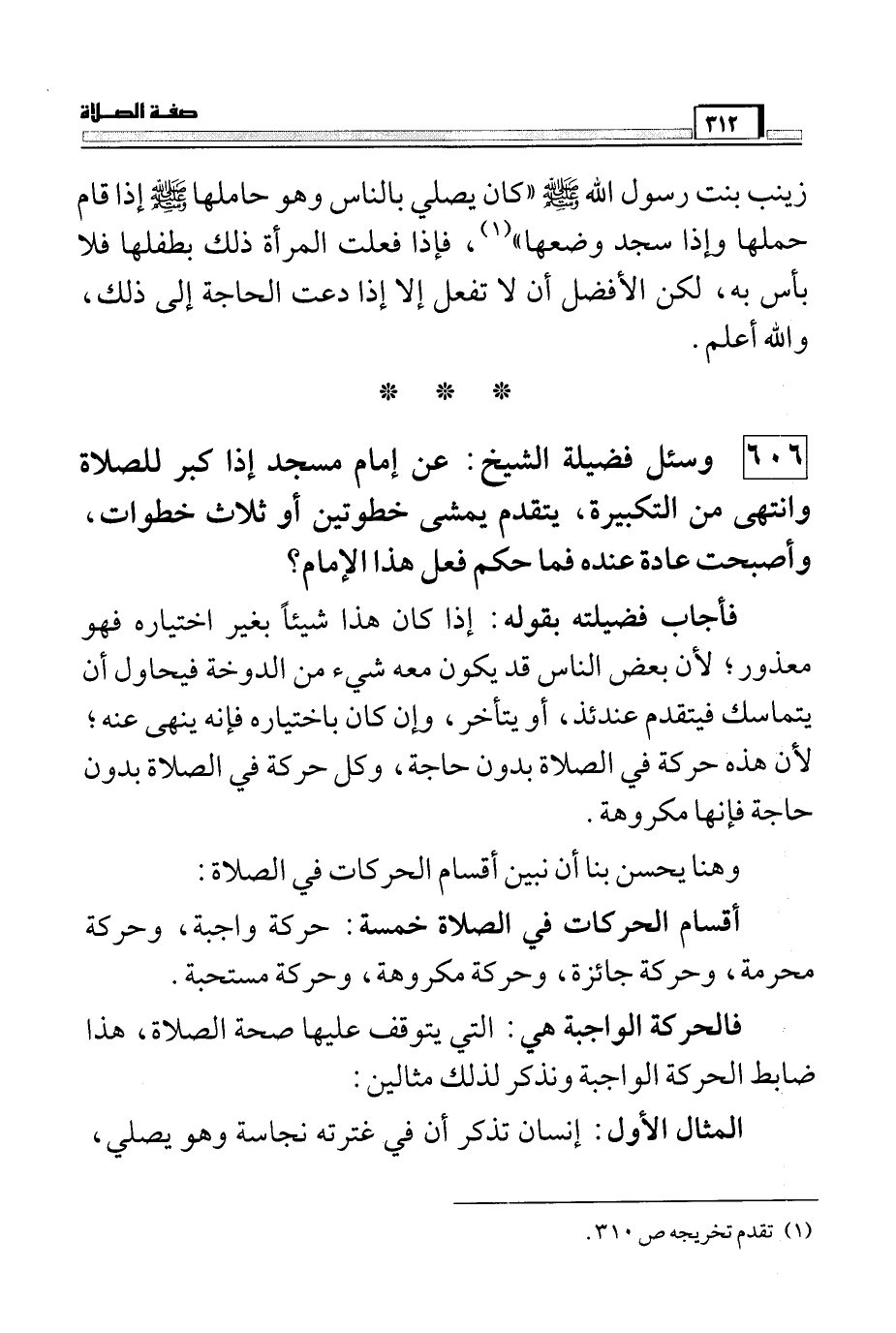 606 وسئل فضيلة الشيخ: عن إمام مسجد إذا كبر للصلاة وانتهى من التكبيرة، يتقدم يمشي خطوتين أو ثلاث خطوات، وأصبحت عادة عنده فما حكم فعل هذا الإمام؟