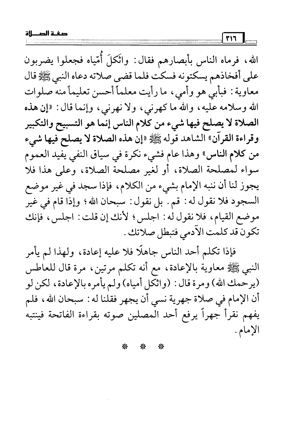 الله، فرماه الناس بأبصارهم فقال: وا ثكل أماه فجعلوا يضربون على أفخاذهم يسكتونه فسكت فلما قضى صلاته دعاه النبي صَلَّى اللَّهُ عَلَيْهِ وَسَلَّمَ قال معاوية: فبأبي هو وأمي، ما رأيت معلماً أحسن تعليماً منه صلوات الله وسلامه عليه، والله ما كهرني، ولا نهرني، وإنما قال: "إن هذه الصلاة لا يصلح فيها شيء من كلام الناس إنما هو التسبيح والتكبير وقراءة القرآن" الشاهد قوله صَلَّى اللَّهُ عَلَيْهِ وَسَلَّمَ "إن هذه الصلاة لا يصلح فيها شيء من كلام الناس" وهذا عام فشيء نكرة في سياق النفي يفيد العموم سواء لمصلحة الصلاة، أو لغير مصلحة الصلاة، وعلى هذا فلا يجوز لنا أن ننبه الإمام بشيء من الكلام، فإذا سجد في غير موضع السجود فلا نقول له: قم. بل نقول: سبحان الله؛ وإذا قام في غير موضع القيام، فلا نقول له: اجلس؛ لأنك إن قلت: اجلس، فإنك تكون قد كلمت الآدمي فتبطل صلاتك.