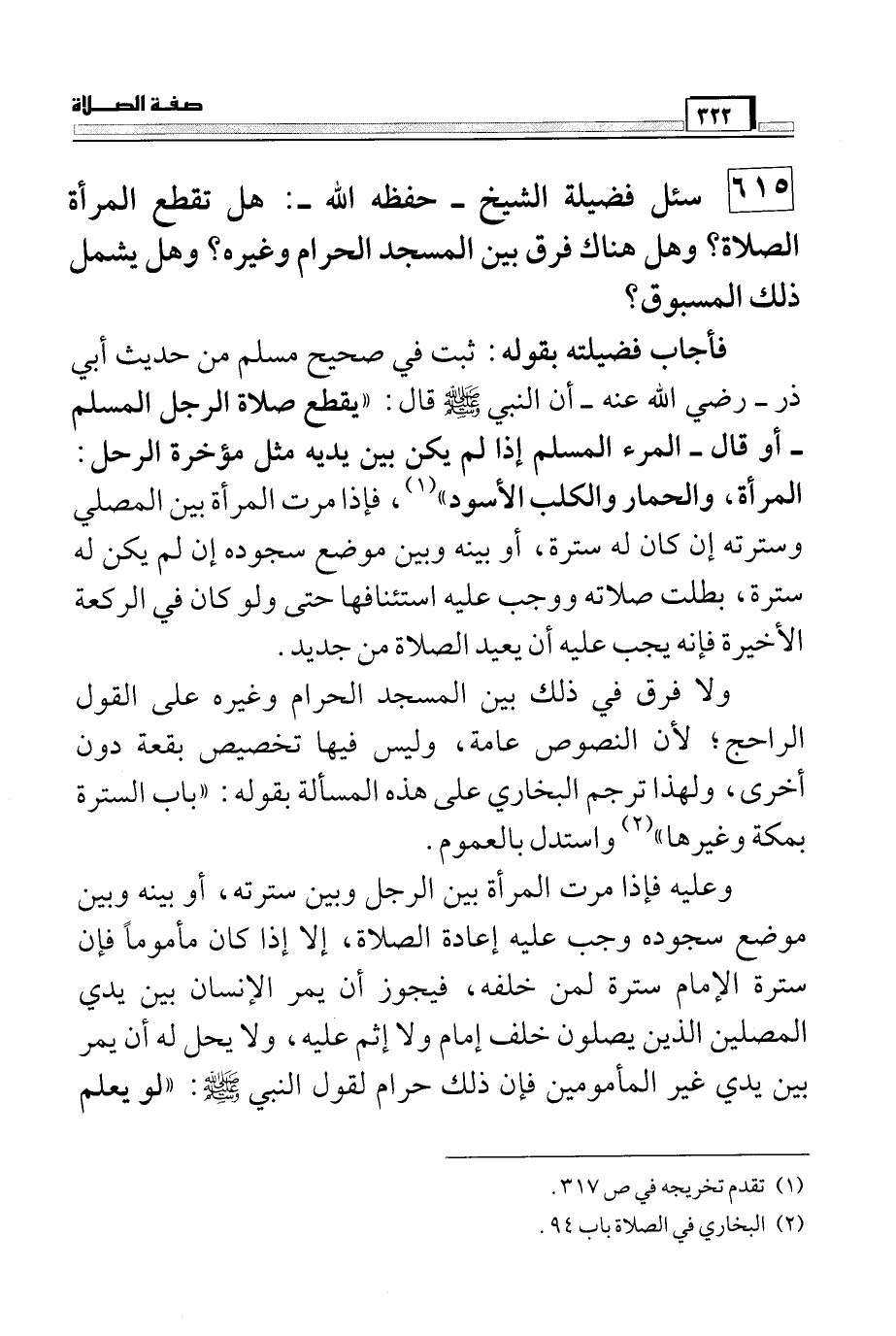 615 سئل فضيلة الشيخ – حفظه الله -: هل تقطع المرأة الصلاة؟ وهل هناك فرق بين المسجد الحرام وغيره؟ وهل يشمل ذلك المسبوق؟
