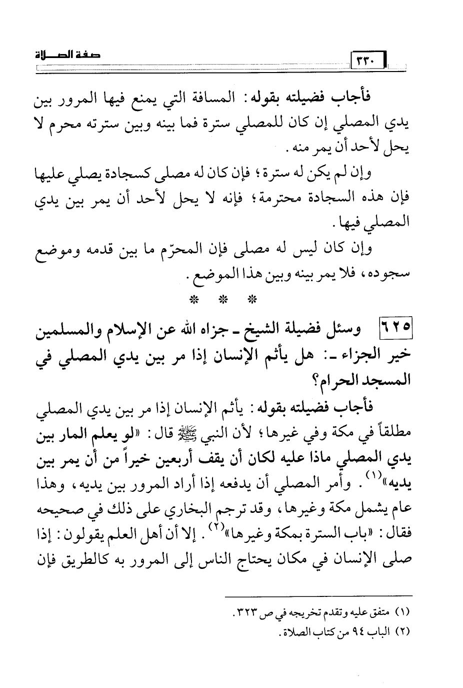 625 وسئل فضيلة الشيخ – جزاه الله عن الإسلام والمسلمين خير الجزاء -: هل يأثم الإنسان إذا مر بين يدي المصلي في المسجد الحرام؟