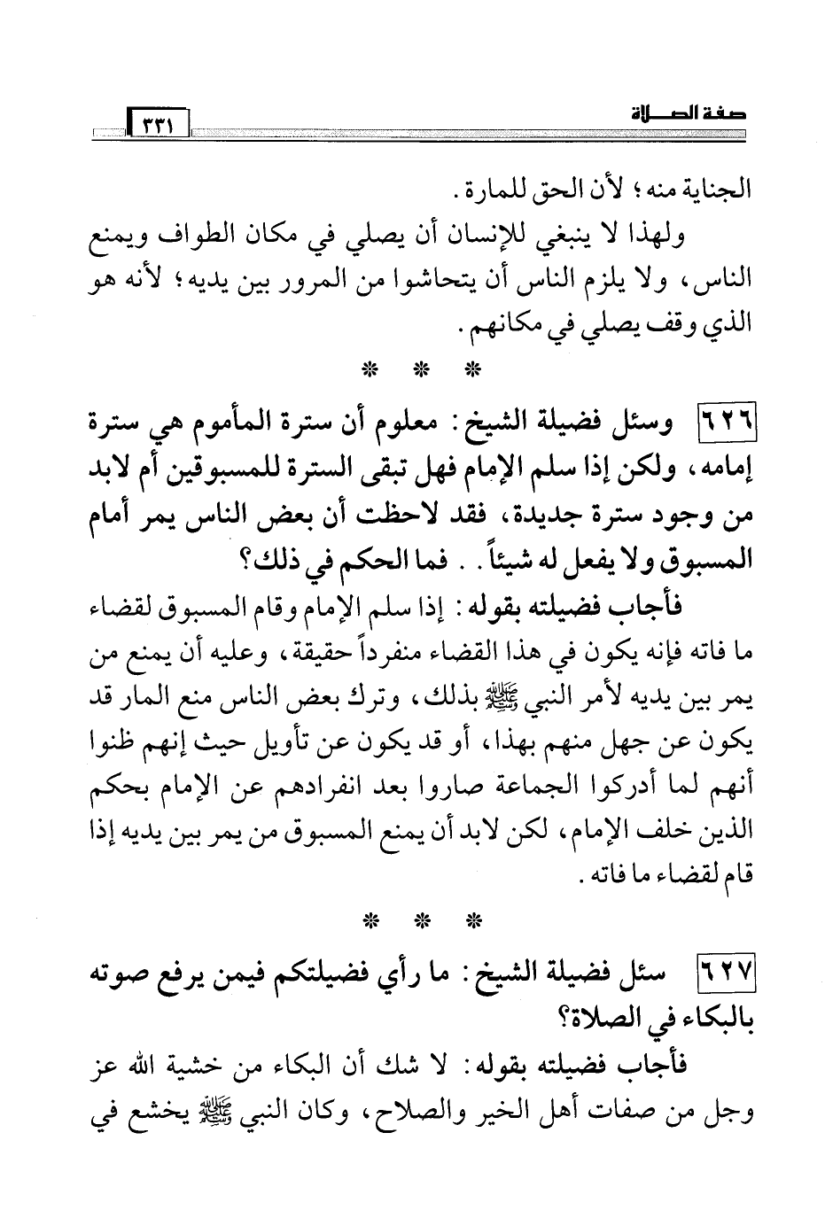 626 وسئل فضيلة الشيخ: معلوم أن سترة المأموم هي سترة إمامه، ولكن إذا سلم الإمام فهل تبقى السترة للمسبوقين أم لابد من وجود سترة جديدة، فقد لاحظت أن بعض الناس يمر أمام المسبوق ولا يفعل له شيئاً.. فما الحكم في ذلك؟