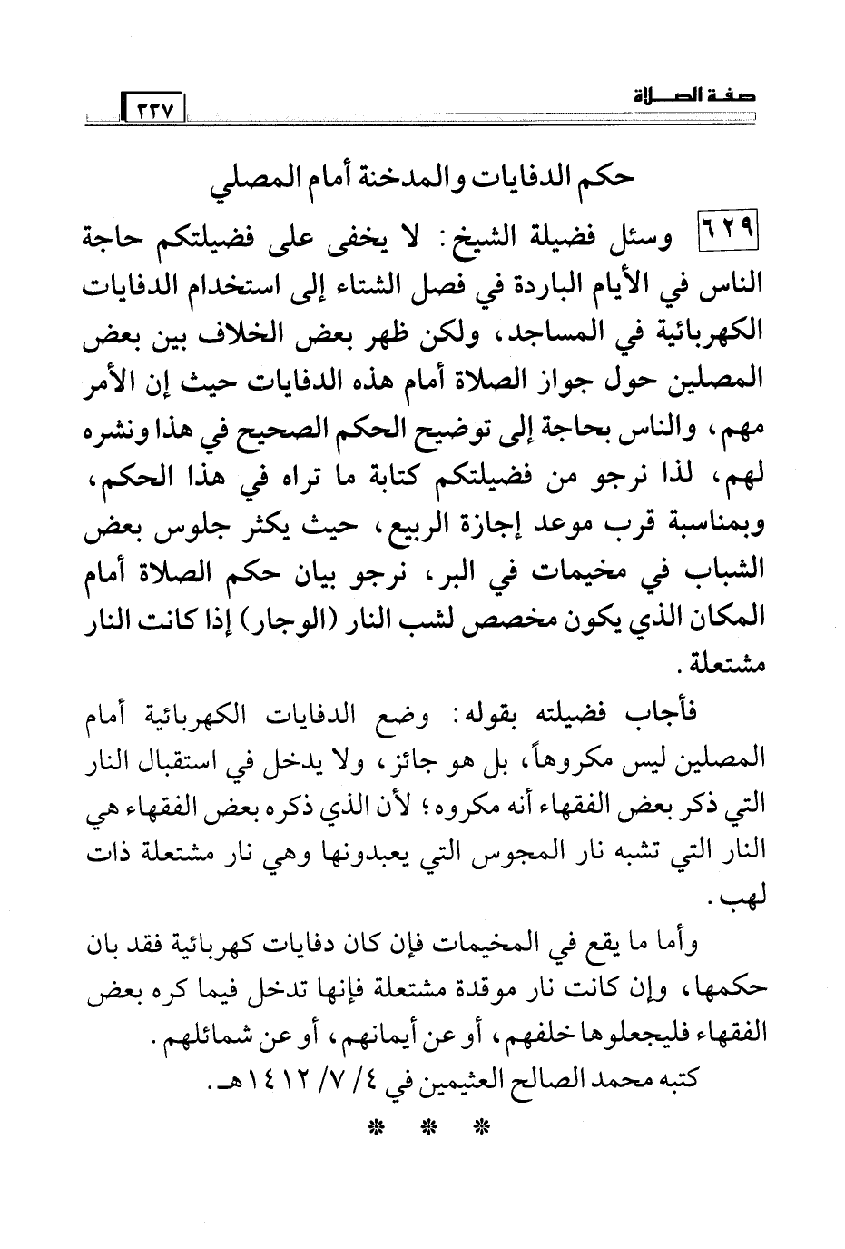 629 وسئل فضيلة الشيخ: لا يخفى على فضيلتكم حاجة الناس في الأيام الباردة في فصل الشتاء إلى استخدام الدفايات الكهربائية في المساجد، ولكن ظهر بعض الخلاف بين بعض المصلين حول جواز الصلاة أمام هذه الدفايات حيث إن الأمر مهم، والناس بحاجة إلى توضيح الحكم الصحيح في هذا ونشره لهم، لذا نرجو من فضيلتكم كتابة ما تراه في هذا الحكم، وبمناسبة قرب موعد إجازة الربيع، حيث يكثر جلوس بعض الشباب في مخيمات في البر، نرجو بيان حكم الصلاة أمام المكان الذي يكون مخصص لشب النار (الوجار) إذا كانت النار مشتعلة.
