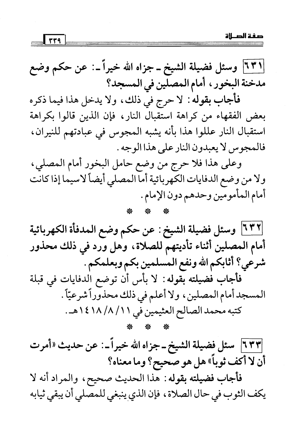 632 وسئل فضيلة الشيخ: عن حكم وضع المدفأة الكهربائية أمام المصلين أثناء تأديتهم للصلاة، وهل ورد في ذلك محذور شرعي؟ أثابكم الله ونفع المسلمين بكم وبعلمكم.
