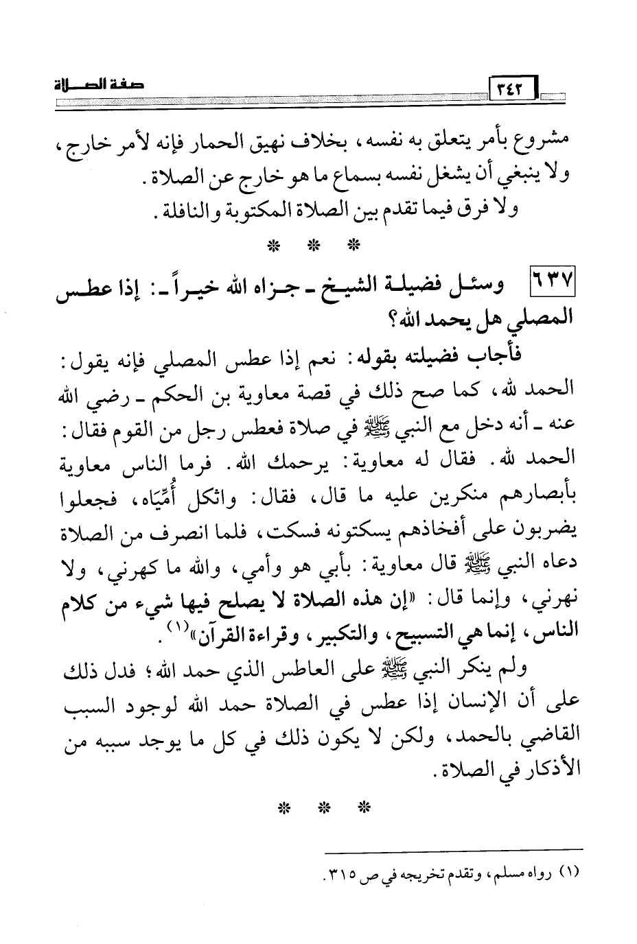 637 وسئل فضيلة الشيخ – جزاه الله خيراً -: إذا عطس المصلي هل يحمد الله؟