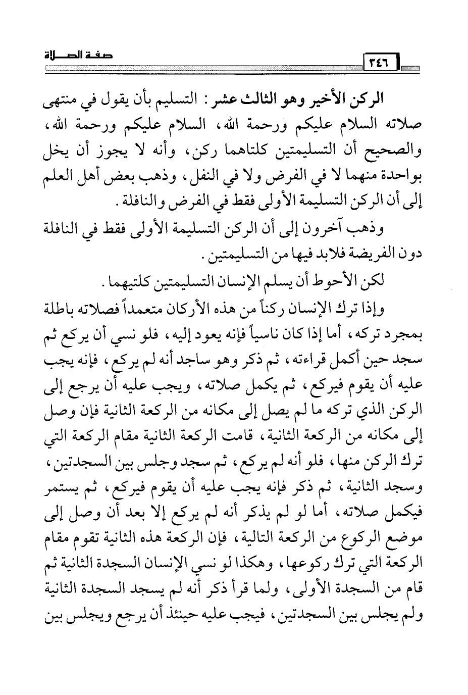 الركن الأخير وهو الثالث عشر: التسليم بأن يقول في منتهى صلاته السلام عليكم ورحمة الله، السلام عليكم ورحمة الله، والصحيح أن التسليمتين كلتاهما ركن، وأنه لا يجوز أن يخل بواحدة منهما لا في الفرض ولا في النفل، وذهب بعض أهل العلم إلى أن الركن التسليمة الأولى فقط في الفرض والنافلة.