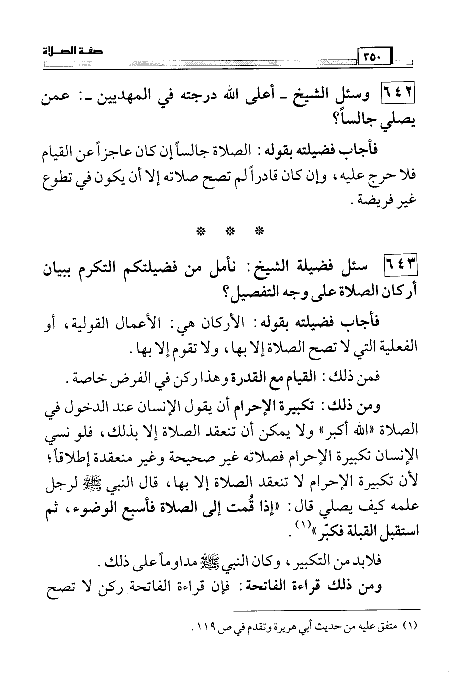 643 سئل فضيلة الشيخ: نأمل من فضيلتكم التكرم ببيان أركان الصلاة على وجه التفصيل؟