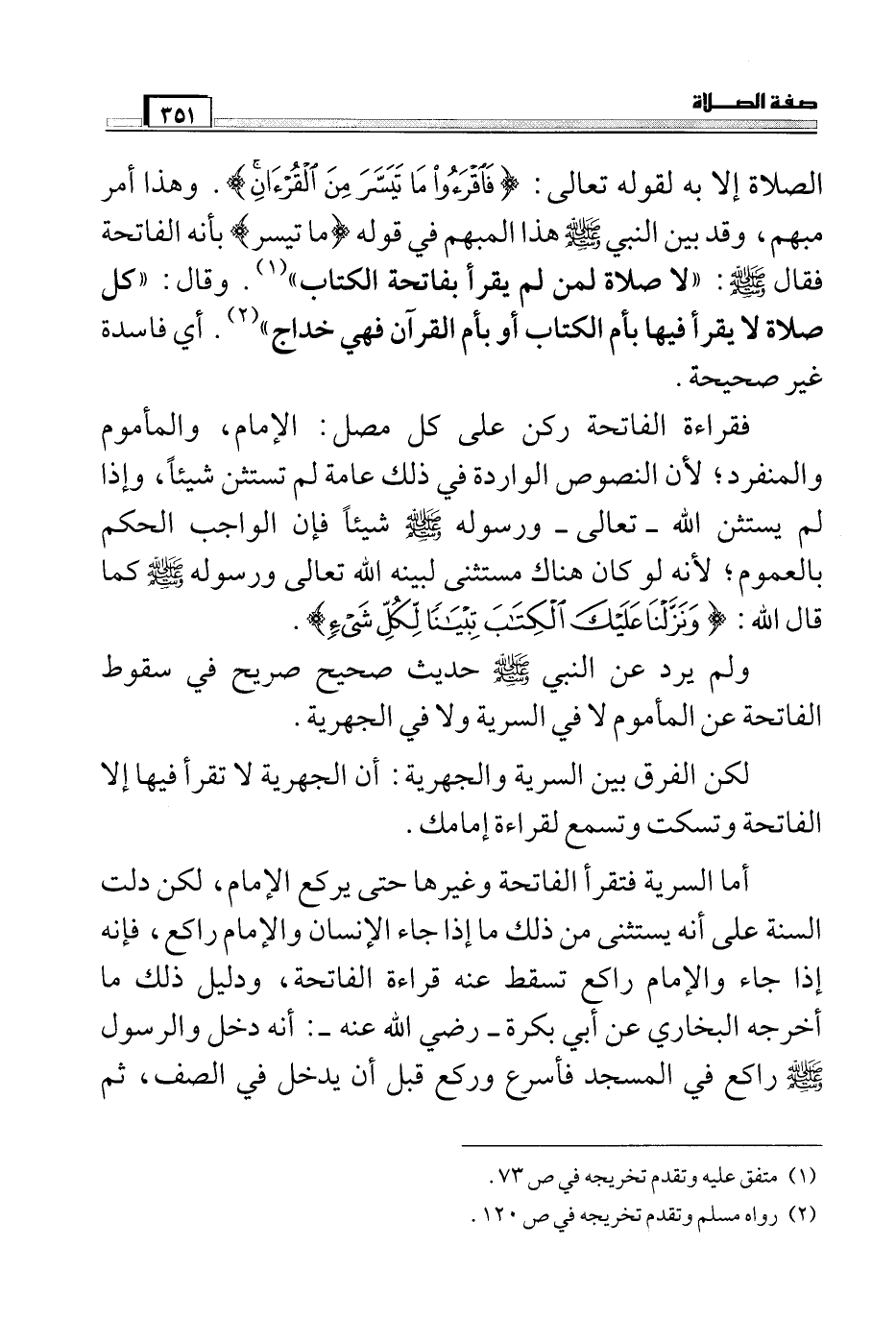 الصلاة إلا به لقوله تعالى: (فَاقْرَأُوا مَا تَيَسَّرَ مِنَ الْقُرْآن) . وهذا أمر مبهم، وقد بين النبي صَلَّى اللَّهُ عَلَيْهِ وَسَلَّمَ هذا المبهم في قوله (مَا تَيَسَّرَ) بأنه الفاتحة فقال صَلَّى اللَّهُ عَلَيْهِ وَسَلَّمَ: "لا صلاة لمن لم يقرأ بفاتحة الكتاب" (¬1) . وقال: "كل صلاة لا يقرأ فيها بأم الكتاب أو بأم القرآن فهي خداج" (¬2) . أي فاسدة غير صحيحة.