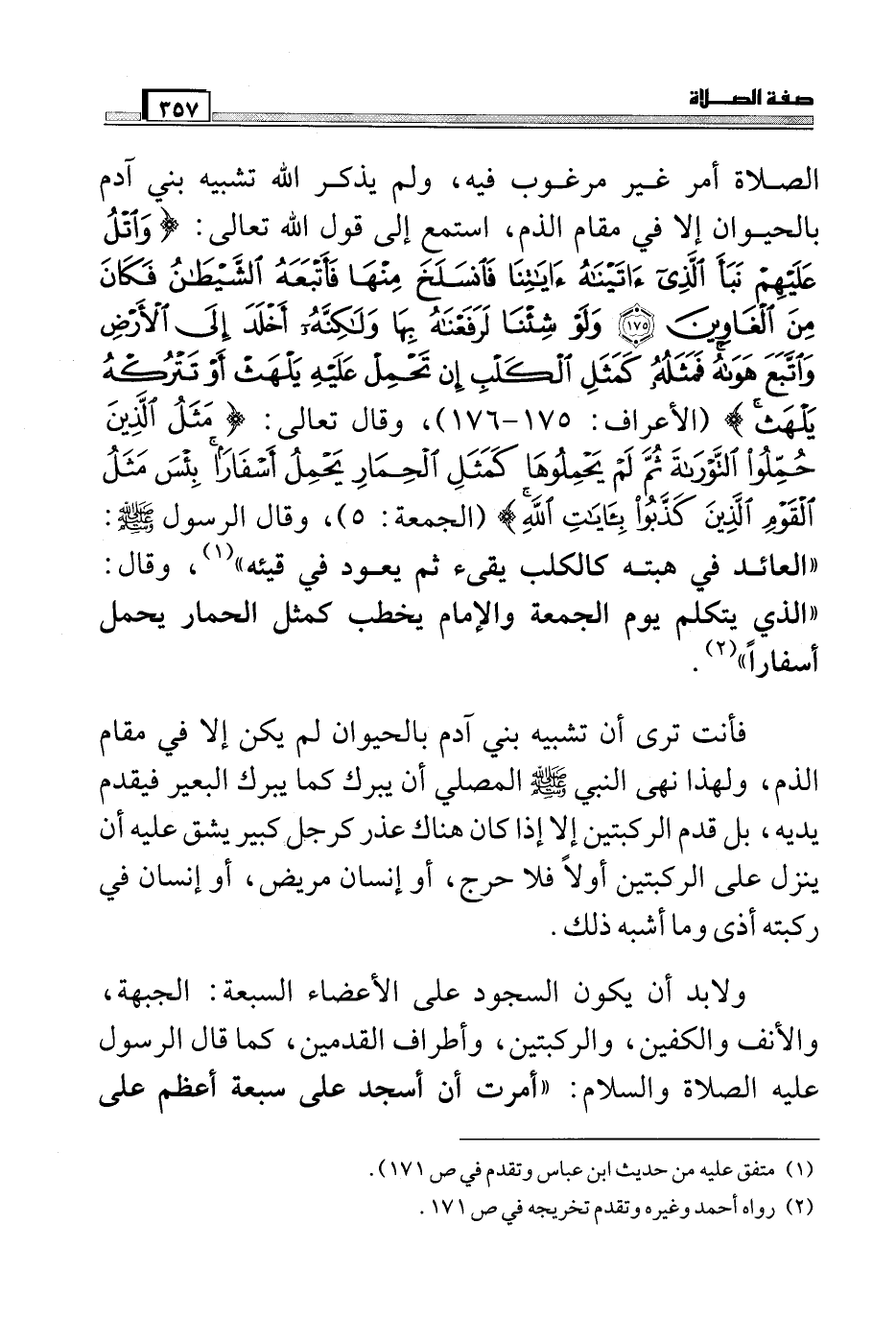 الصلاة أمر غير مرغوب فيه، ولم يذكر الله تشبيه بني آدم بالحيوان إلا في مقام الذم، استمع إلى قول الله تعالى: (وَاتْلُ عَلَيْهِمْ نَبَأَ الَّذِي آتَيْنَاهُ آيَاتِنَا فَانْسَلَخَ مِنْهَا فَأَتْبَعَهُ الشَّيْطَانُ فَكَانَ مِنَ الْغَاوِينَ* وَلَوْ شِئْنَا لَرَفَعْنَاهُ بِهَا وَلَكِنَّهُ أَخْلَدَ إِلَى الْأَرْضِ وَاتَّبَعَ هَوَاهُ فَمَثَلُهُ كَمَثَلِ الْكَلْبِ إِنْ تَحْمِلْ عَلَيْهِ يَلْهَثْ أَوْ تَتْرُكْهُ يَلْهَثْ) (الأعراف: 175-176) ، وقال تعالى: (مَثَلُ الَّذِينَ حُمِّلُوا التَّوْرَاةَ ثُمَّ لَمْ يَحْمِلُوهَا كَمَثَلِ الْحِمَارِ يَحْمِلُ أَسْفَاراً بِئْسَ مَثَلُ الْقَوْمِ الَّذِينَ كَذَّبُوا بِآياتِ اللَّهِ) (الجمعة: 5) ، وقال الرسول صَلَّى اللَّهُ عَلَيْهِ وَسَلَّمَ: "العائد في هبته كالكلب يقيئ ثم يعود في قيئه" (¬1) ، وقال: "الذي يتكلم يوم الجمعة والإمام يخطب كمثل الحمار يحمل أسفاراً" (¬2) .