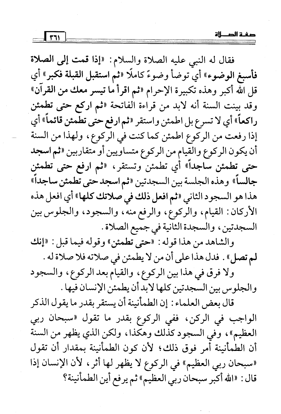 والشاهد من هذا قوله: "حتى تطمئن" وقوله فيما قبل: "إنك لم تصل". فدل هذا على أن من لا يطمئن في صلاته فلا صلاة له.