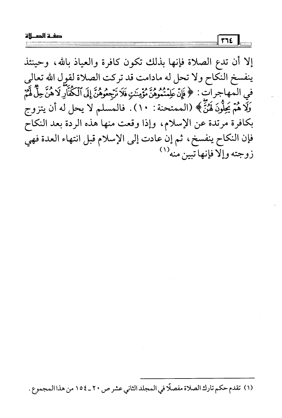 إلا أن تدع الصلاة فإنها بذلك تكون كافرة والعياذ بالله، وحينئذ ينفسخ النكاح ولا تحل له مادامت قد تركت الصلاة لقول الله تعالى في المهاجرات: (فَإِنْ عَلِمْتُمُوهُنَّ مُؤْمِنَاتٍ فَلا تَرْجِعُوهُنَّ إِلَى الْكُفَّارِ لا هُنَّ حِلٌّ لَهُمْ وَلا هُمْ يَحِلُّونَ لَهُن) (الممتحنة: 10) . فالمسلم لا يحل له أن يتزوج بكافرة مرتدة عن الإسلام، وإذا وقعت منها هذه الردة بعد النكاح فإن النكاح ينفسخ، ثم إن عادت إلى الإسلام قبل انتهاء العدة لهي زوجته وإلا فإنها تبين منه (¬1) .