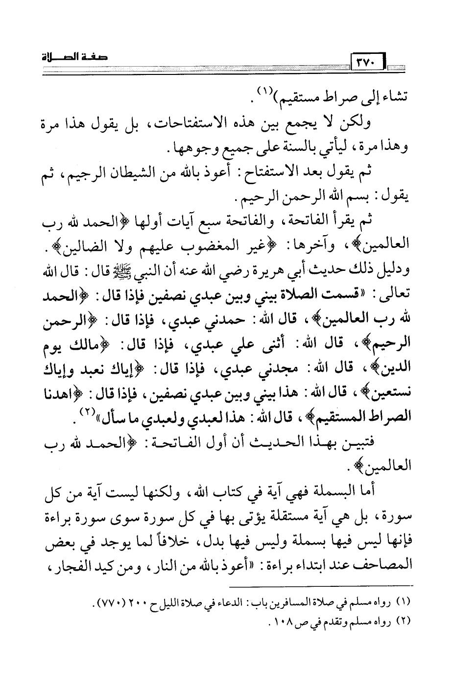 ثم يقرأ الفاتحة، والفاتحة سبع آيات أولها (الحمد لله رب العالمين) ، وآخرها: (غير المغضوب عليهم ولا الضالين) . ودليل ذلك حديث أبي هريرة رضي الله عنه أن النبي صَلَّى اللَّهُ عَلَيْهِ وَسَلَّمَ قال: قال الله تعالى: "قسمت الصلاة بيني وبين عبدي نصفين فإذا قال: (الحمد لله رب العالمين) ، قال الله: حمدني عبدي، فإذا قال: (الرحمن الرحيم) ، قال الله: أثنى عليّ عبدي، فإذا قال: (مالك يوم الدين) ، قال الله: مجدني عبدي، فإذا قال: (إياك نعبد وإياك نستعين) ، قال الله: هذا بيني وبين عبدي نصفين، فإذا قال: (اهدنا الصراط المستقيم) ، قال الله: هذا لعبدي ولعبدي ما سأل" (¬2) .