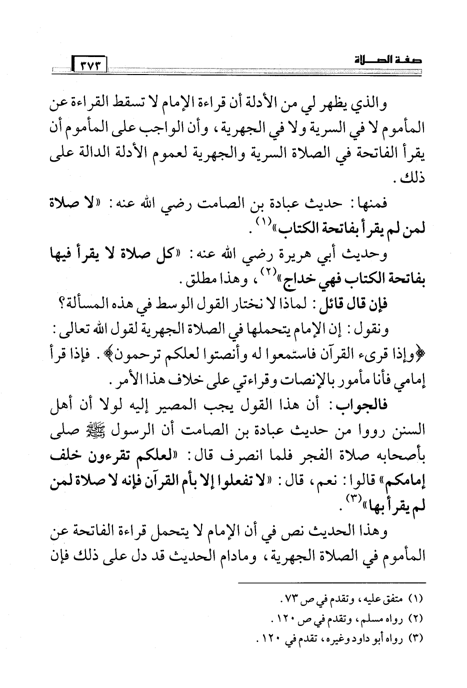 فالجواب: أن هذا القول يجب المصير إليه لولا أن أهل السنن رووا من حديث عبادة بن الصامت أن الرسول صَلَّى اللَّهُ عَلَيْهِ وَسَلَّمَ صلى بأصحابه صلاة الفجر فلما انصرف قال: "لعلكم تقرءون خلف إمامكم" قالوا: نعم، قال: "لا تفعلوا إلا بأم القرآن فإنه لا صلاة لمن لم يقرأ بها" (¬3) .