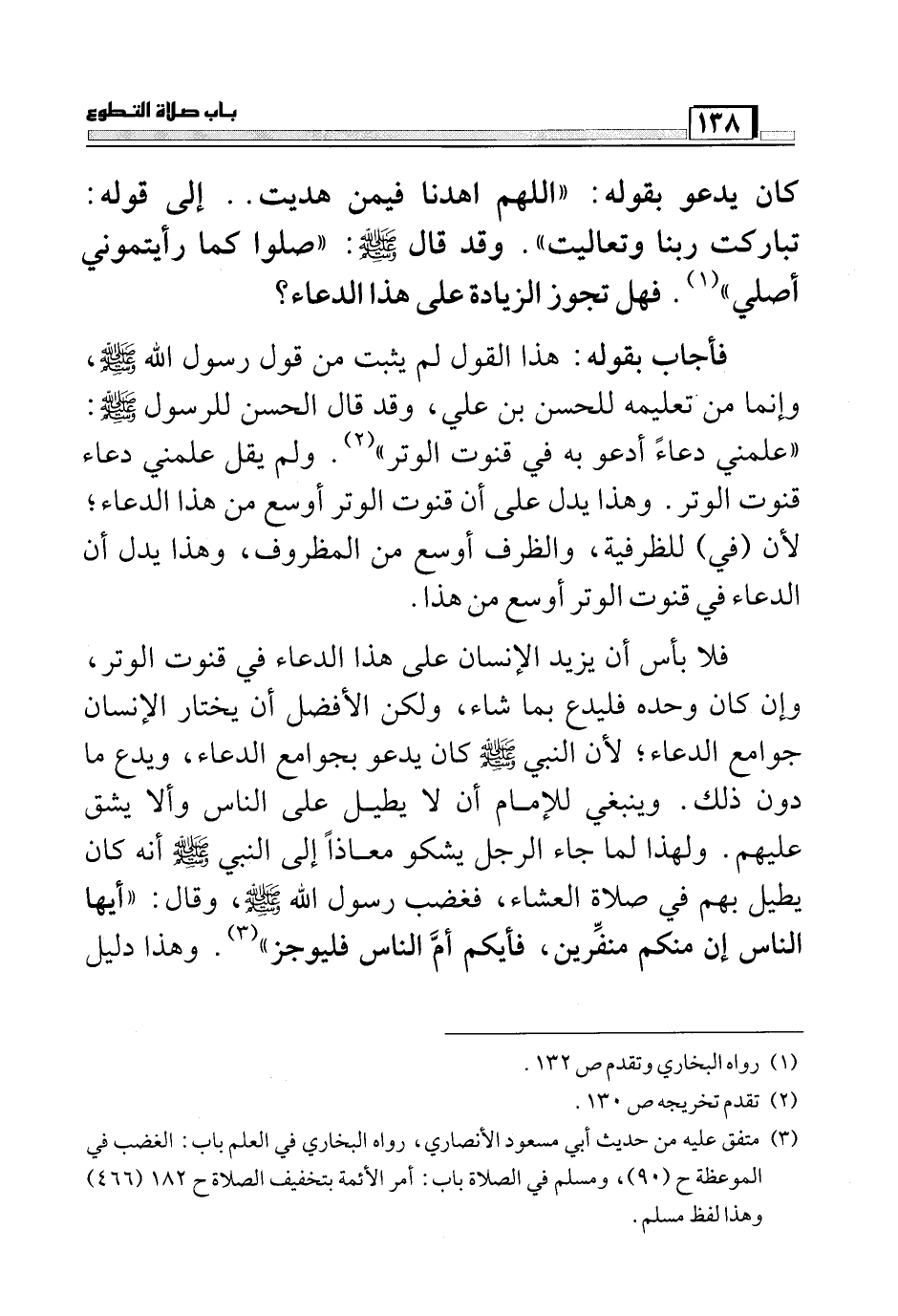 فأجاب بقوله: هذا القول لم يثبت من قول رسول الله صَلَّى اللَّهُ عَلَيْهِ وَسَلَّمَ، وإنما من تعليمه للحسن بن علي، وقد قال الحسن للرسول صَلَّى اللَّهُ عَلَيْهِ وَسَلَّمَ: "علمني دعاءً أدعو به في قنوت الوتر" (¬2) . ولم يقل علمني دعاء قنوت الوتر. وهذا يدل على أن قنوت الوتر أوسع من هذا الدعاء؛ لأن (في) للظرفية، والظرف أوسع من المظروف، وهذا يدل أن الدعاء في قنوت الوتر أوسع من هذا. ...