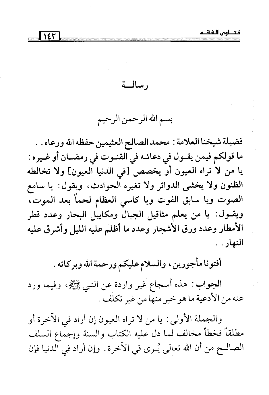 فضيلة شيخنا العلامة: محمد الصالح العثيمين حفظه الله ورعاه.. ما قولكم فيمن يقول في دعائه في القنوت في رمضان أو غيره: يا من لا تراه العيون أو يخصص [في الدنيا العيون] ولا تخالطه الظنون ولا يخشى الدوائر ولا تغيره الحوادث، ويقول: يا سامع الصوت ويا سابق الفوت ويا كاسي العظام لحماً بعد الموت، ويقول: يا من يعلم مثاقيل الجبال ومكاييل البحار وعدد قطر الأمطار وعدد ورق الأشجار وعدد ما أظلم عليه الليل وأشرق عليه النهار.