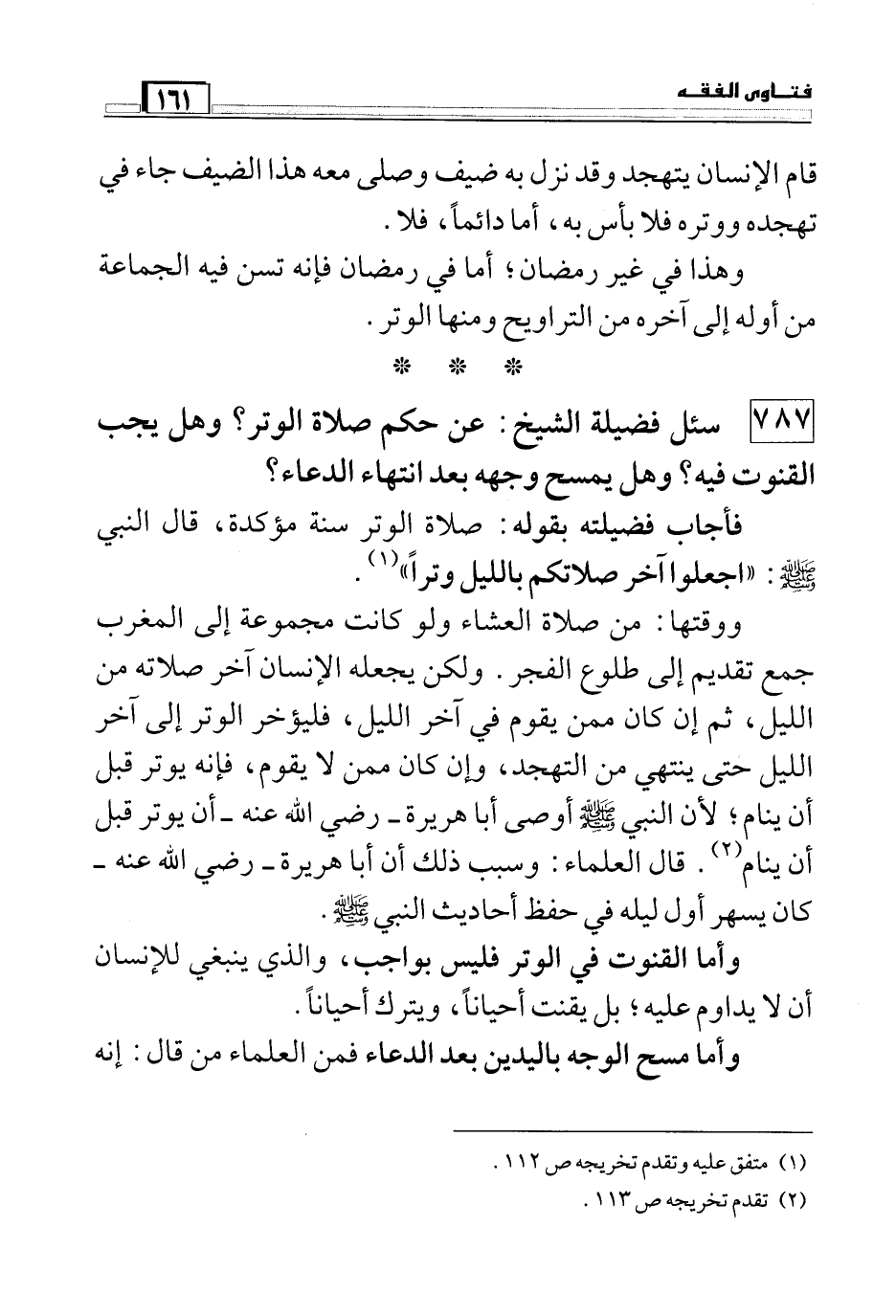 787 سئل فضيلة الشيخ: عن حكم صلاة الوتر؟ وهل يجب القنوت فيه؟ وهل يمسح وجهه بعد انتهاء الدعاء؟