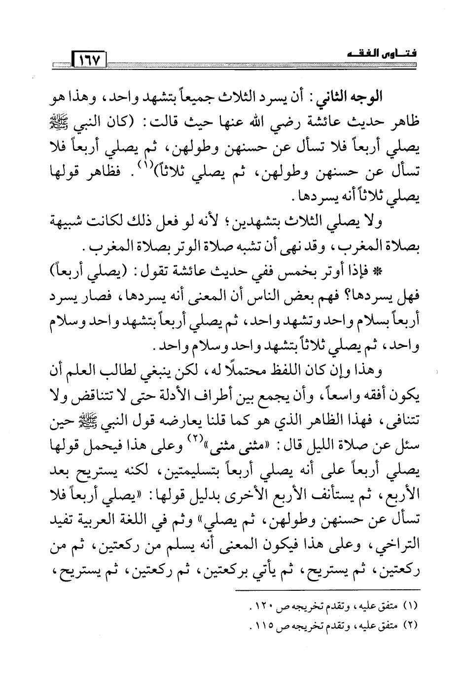 الوجه الثاني: أن يسرد الثلاث جميعاً بتشهد واحد، وهذا هو ظاهر حديث عائشة رضي الله عنها حيث قالت: (كان النبي صَلَّى اللَّهُ عَلَيْهِ وَسَلَّمَ يصلي أربعاً فلا تسأل عن حسنهن وطولهن، ثم يصلي أربعاً فلا تسأل عن حسنهن وطولهن، ثم يصلي ثلاثاً) (¬1) . فظاهر قولها يصلي ثلاثاً أنه يسردها.