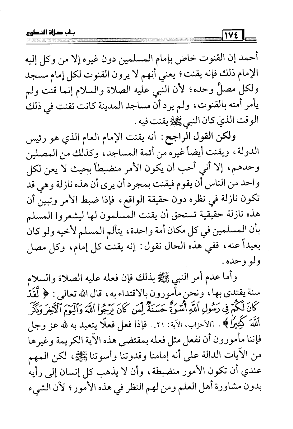 ولكن القول الراجح: أنه يقنت الإمام العام الذي هو رئيس الدولة، ويقنت أيضاً غيره من أئمة المساجد، وكذلك من المصلين وحدهم، إلا أني أحب أن يكون الأمر منضبطاً بحيث لا يعن لكل واحد من الناس أن يقوم فيقنت بمجرد أن يرى أن هذه نازلة وهي قد تكون نازلة في نظره دون حقيقة الواقع، فإذا ضبط الأمر وتبين أن هذه نازلة حقيقية تستحق أن يقنت المسلمون لها ليشعروا المسلم بأن المسلمين في كل مكان أمة واحدة، يتألم المسلم لأخيه ولو كان بعيداً عنه، ففي هذه الحال نقول: إنه يقنت كل إمام، وكل مصل ولو وحده.