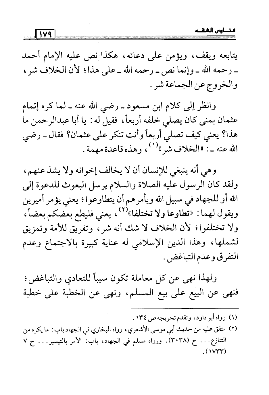 وانظر إلى كلام ابن مسعود – رضي لله عنه – لما كره إتمام عثمان بمنى كان يصلي خلفه أربعاً، فقيل له: يا أبا عبد الرحمن ما هذا؟ يعني كيف يصلي أربعاً وأنت تنكر على عثمان؟ فقال – رضي الله عنه -: "الخلاف شر" (¬1) ، وهذه قاعدة مهمة.