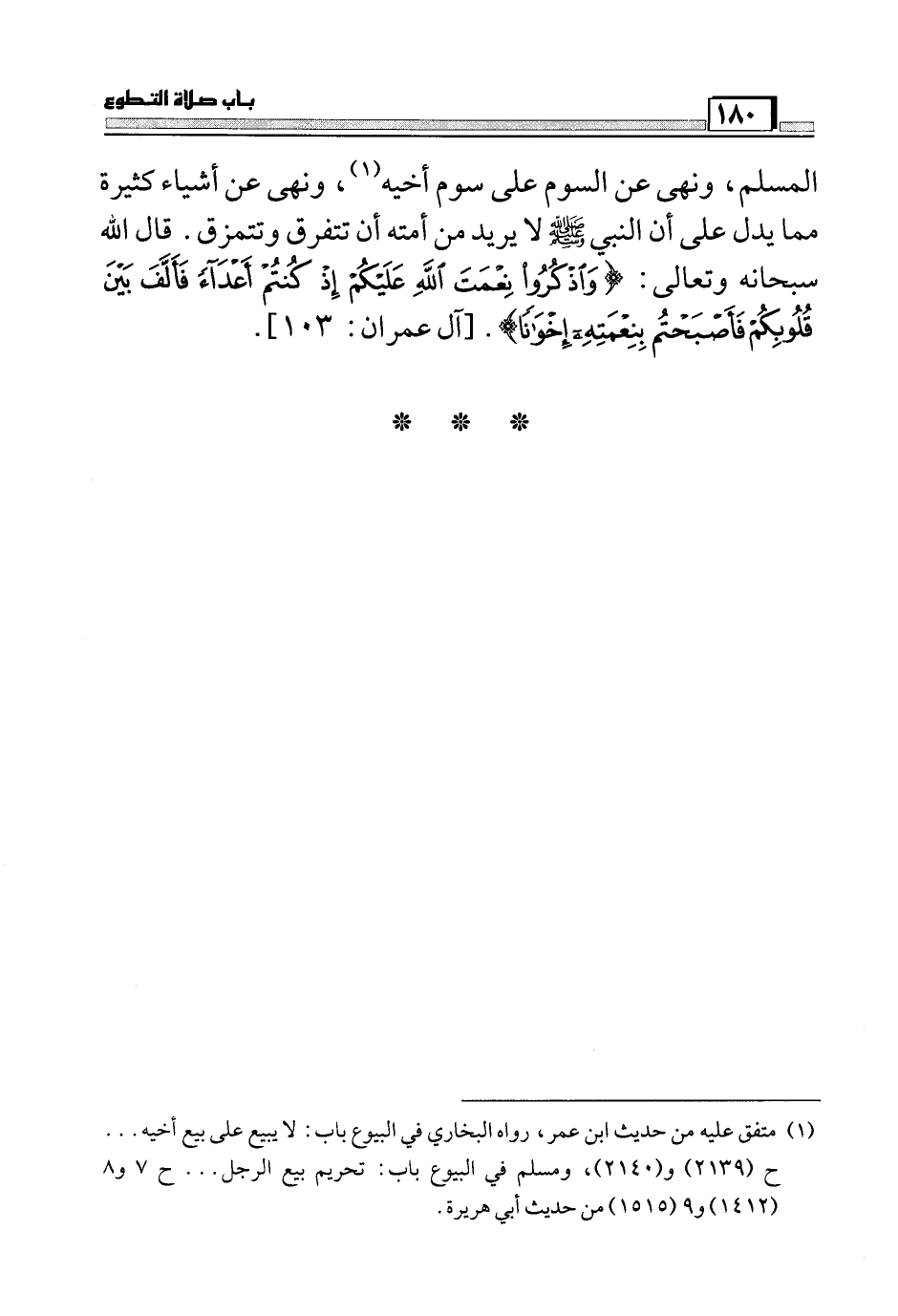المسلم، ونهى عن السوم على سوم أخيه (¬1) ، ونهى عن أشياء كثيرة مما يدل على أن النبي صَلَّى اللَّهُ عَلَيْهِ وَسَلَّمَ لا يريد من أمته أن تتفرق وتتمزق. قال الله سبحانه وتعالى: (وَاذْكُرُوا نِعْمَتَ اللَّهِ عَلَيْكُمْ إِذْ كُنْتُمْ أَعْدَاءً فَأَلَّفَ بَيْنَ قُلُوبِكُمْ فَأَصْبَحْتُمْ بِنِعْمَتِهِ إِخْوَاناً) (آل عمران: 103) .