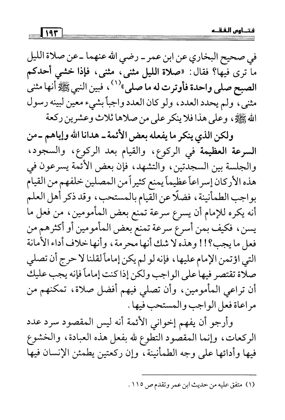 ولكن الذي ينكر ما يفعله بعض الأئمة – هدانا الله وإياهم – من السرعة العظيمة في الركوع، والقيام بعد الركوع، والسجود، والجلسة بين السجدتين، والتشهد، فإن بعض الأئمة يسرعون في هذه الأركان إسراعاً عظيماً يمنع كثيراً من المصلين خلفهم من القيام بواجب الطمأنينة، فضلاً عن القيام بالمستحب، وقد ذكر أهل العلم أنه يكره للإمام أن يسرع سرعة تمنع بعض المأمومين، من فعل ما يسن، فكيف بمن أسرع سرعة تمنع بعض المأمومين أو أكثرهم من فعل ما يجب؟!! وهذه لا شك أنها محرمة، وأنها خلاف أداء الأمانة التي أؤتمن الإمام عليها، فإنه لو لم يكن إماماً لقلنا لا حرج أن تصلي صلاة تقتصر فيها على الواجب ولكن إذا كنت إماماً فإنه يجب عليك أن تراعي المأمومين، وأن تصلي فيهم أفضل صلاة، تمكنهم من مراعاة فعل الواجب والمستحب فيها.