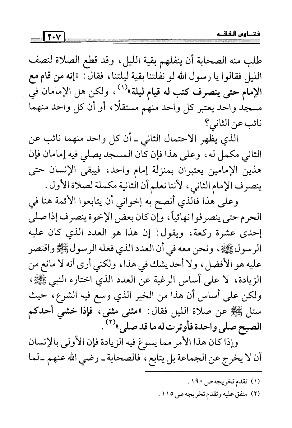 طلب منه الصحابة أن ينفلهم بقية الليل، وقد قطع الصلاة لنصف الليل فقالوا يا رسول الله لو نفلتنا بقية ليلتنا، فقال: "إنه من قام مع الإمام حتى ينصرف كتب له قيام ليلة" (¬1) ، ولكن هل الإمامان في مسجد واحد يعتبر كل واحد منهم مستقلاً، أو أن كل واحد منهما نائب عن الثاني؟
