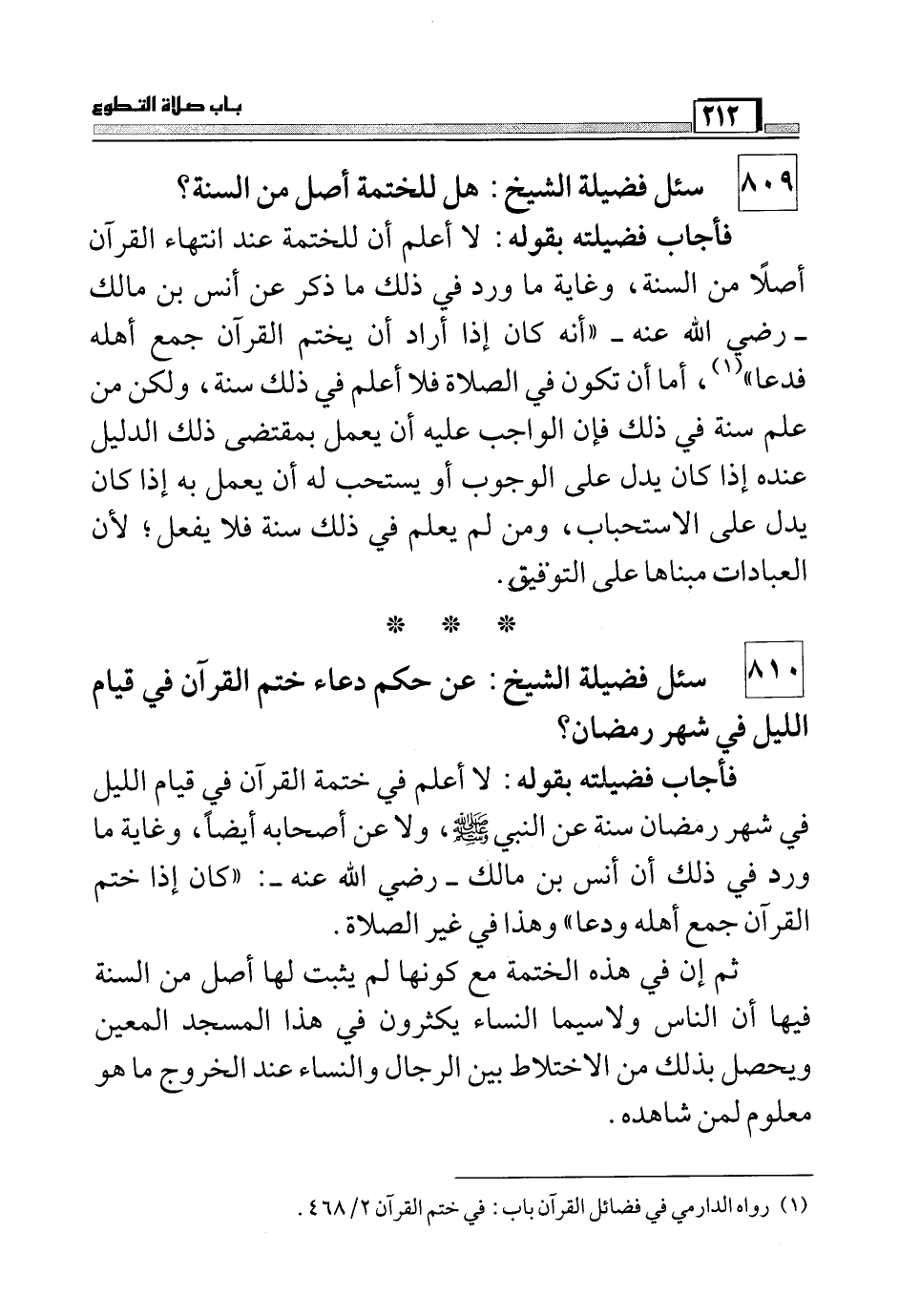 (¬1) رواه الدارمي في فضائل القرآن باب: في ختم القرآن 2/468.