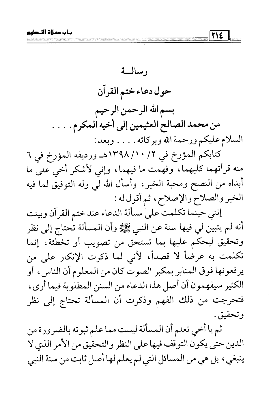 إنني حينما تكلمت على مسألة الدعاء عند ختم القرآن وبينت أنه لم يتبين لي فيها سنة عن النبي صَلَّى اللَّهُ عَلَيْهِ وَسَلَّمَ وأن المسألة تحتاج إلى نظر وتحقيق ليحكم عليها بما تستحق من تصويب أو تخطئة، إنما تكلمت به عرضاً لا قصداً، لأني لما ذكرت الإنكار على من يرفعونها فوق المنابر بمكبر الصوت كان من المعلوم أن الناس، أو الكثير سيفهمون أن أصل هذا الدعاء من السنن المطلوبة فيما أرى، فتحرجت من ذلك الفهم وذكرت أن المسألة تحتاج إلى نظر وتحقيق.