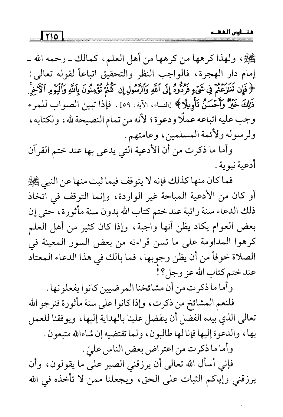 فما كان منها كذلك فإنه لا يتوقف فيما ثبت منها عن النبي صَلَّى اللَّهُ عَلَيْهِ وَسَلَّمَ أو كان من الأدعية المباحة غير الواردة، وإنما التوقف في اتخاذ ذلك الدعاء سنة رابتة عند ختم كتاب الله بدون سنة مأثورة، حتى إن بعض العوام يكاد يظن أنها واجبة، وإذا كان كثير من أهل العلم كرهوا المداومة على ما تسن قراءته من بعض السور المعينة في الصلاة خوفاً من أن يظن وجوبها، فما بالك في هذا الدعاء المعتاد عند ختم كتاب الله عز وجل؟!