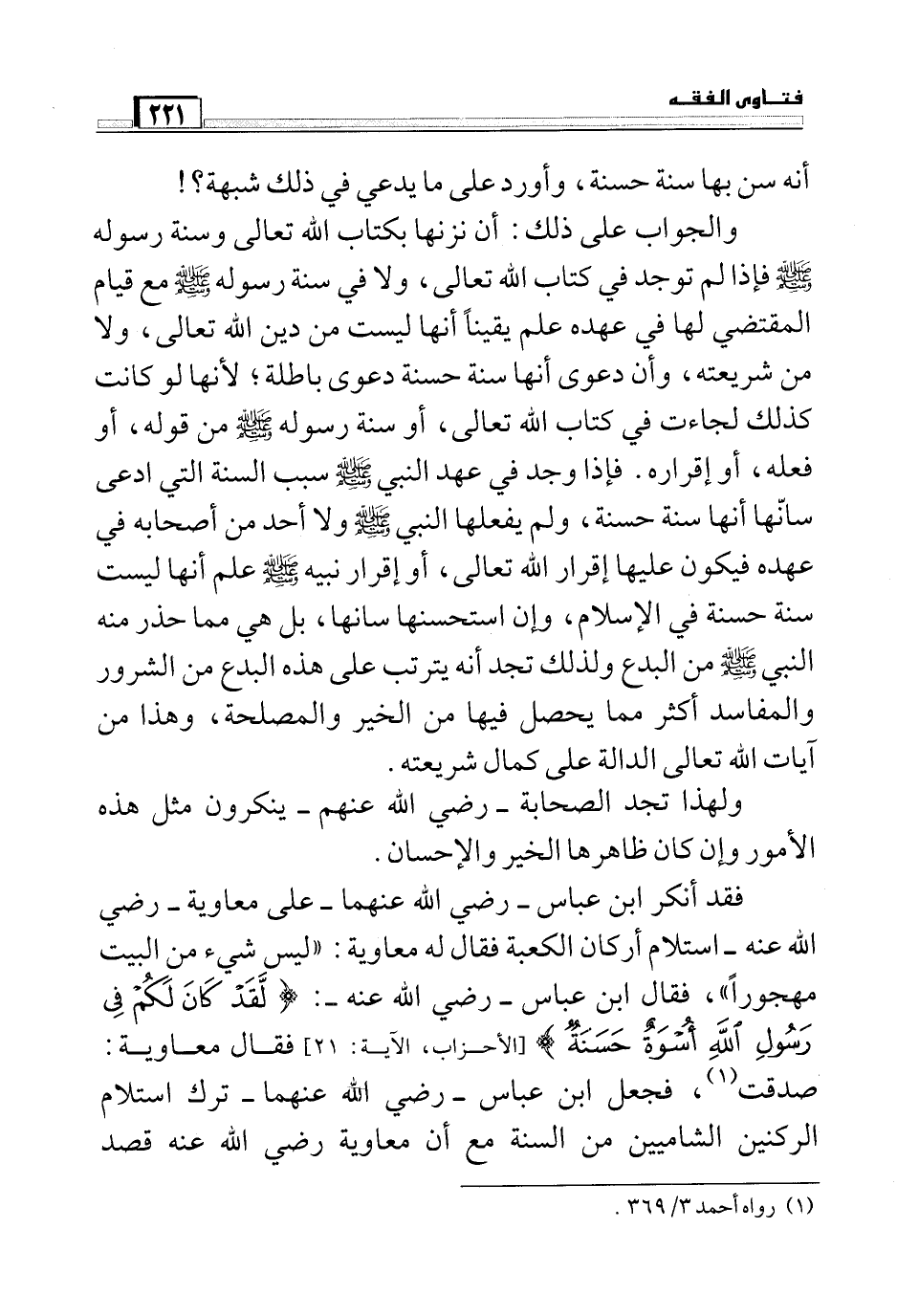 فقد أنكر ابن عباس – رضي الله عنهما – على معاوية – رضي الله عنه – استلام أركان الكعبة فقال له معاوية: "ليس شيء من البيت مهجوراً"، فقال ابن عباس – رضي الله عنه -: (لَقَدْ كَانَ لَكُمْ فِي رَسُولِ اللَّهِ أُسْوَةٌ حَسَنَةٌ) (الأحزاب: 21) فقال معاوية: صدقت (¬1) ، فجعل ابن عباس – رضي الله عنهما – ترك استلام الركنين الشاميين من السنة مع أن معاوية رضي الله عنه قصد