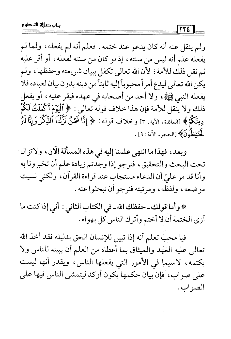 ولم ينقل عنه أنه كان يدعو عند ختمه. فعلم أنه لم يفعله، ولما لم يفعله علم أنه ليس من سنته، إذ لو كان من سنته لفعله، أو أقر عليه ثم نقل ذلك للأمة؛ لأن الله تعالى تكفل ببيان شريعته وحفظها، ولم يكن الله تعالى ليدع أمراً محبوباً إليه ثابتاً من دينه بدون بيان لعباده فلا يفعله النبي صَلَّى اللَّهُ عَلَيْهِ وَسَلَّمَ، ولا أحد من أصحابه في عهده فيقر عليه، أو يفعل ذلك ولا ينقل للأمة فإن هذا خلاف قوله تعالى: (الْيَوْمَ أَكْمَلْتُ لَكُمْ دِينَكُمْ) (المائدة: 3) وخلاف قوله: (إِنَّا نَحْنُ نَزَّلْنَا الذِّكْرَ وَإِنَّا لَهُ لَحَافِظُونَ) (الحجر: 9) .