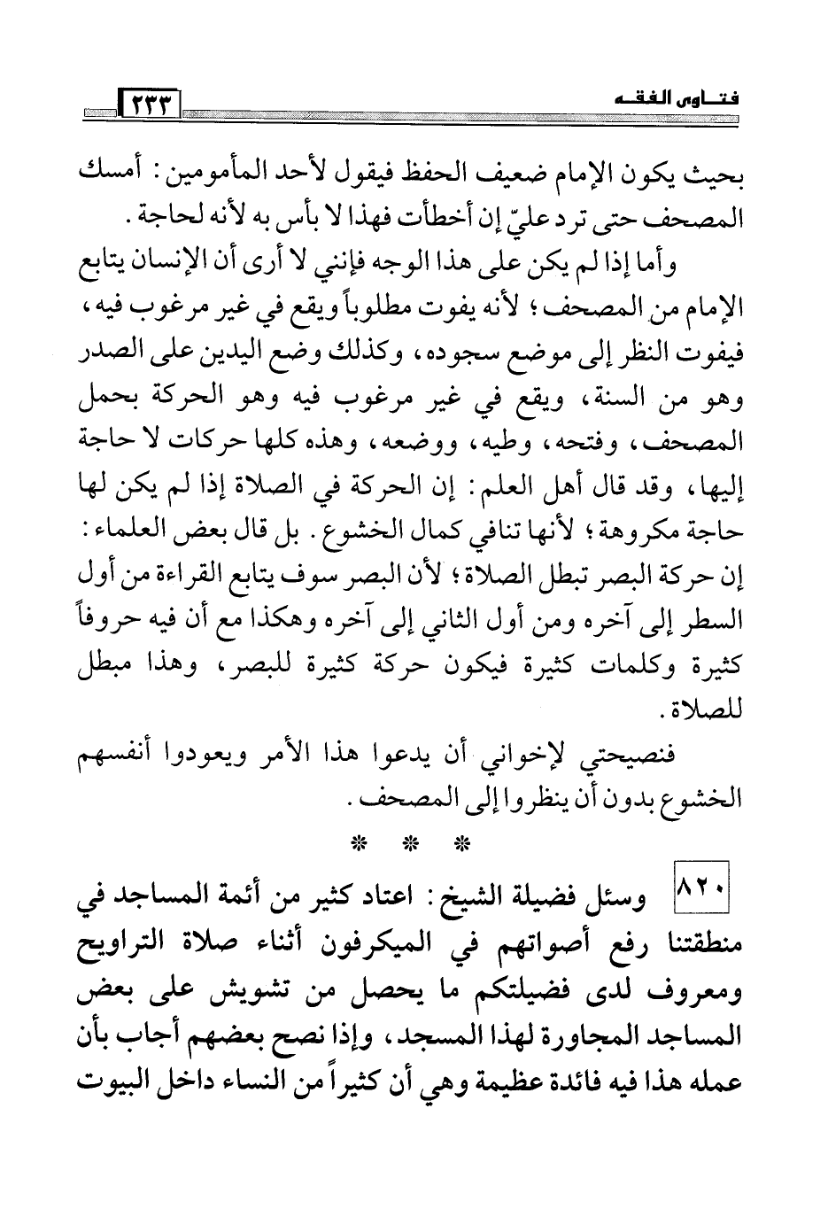 820 وسئل فضيلة الشيخ: اعتاد كثير من أئمة المساجد في منطقتنا رفع أصواتهم في الميكرفون أثناء صلاة التراويح ومعروف لدى فضيلتكم ما يحصل من تشويش على بعض المساجد المجاورة لهذا المسجد، وإذا نصح بعضهم أجاب بأن عمله هذا فيه فائدة عظيمة وهي أن كثيراً من النساء داخل البيوت