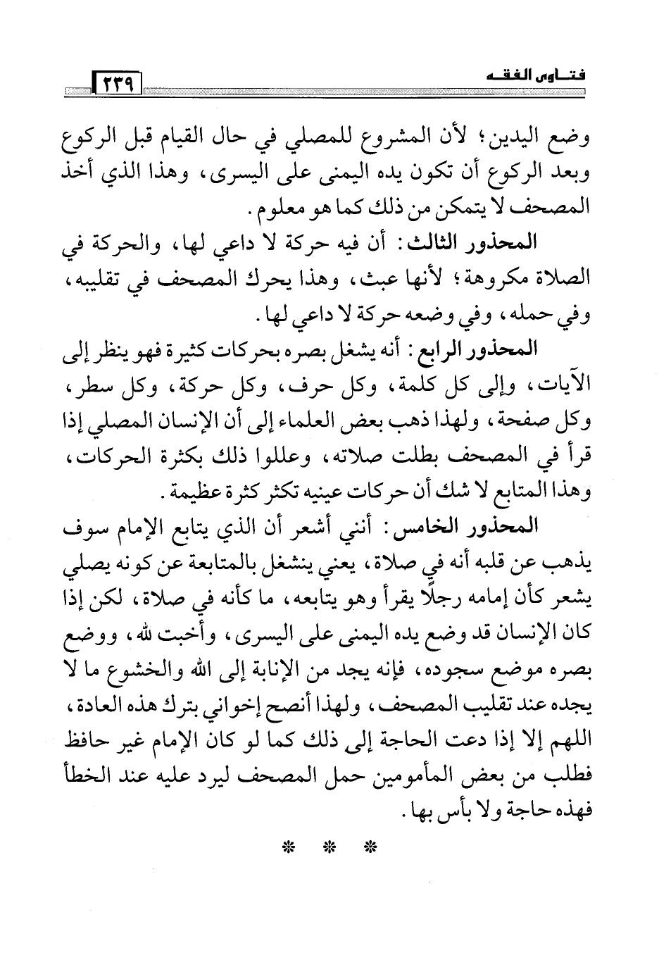 المحذور الثالث: أن فيه حركة لا داعي لها، والحركة في الصلاة مكروهة؛ لأنها عبث، وهذا يحرك المصحف في تقليبه، وفي حمله، وفي وضعه حركة لا داعي لها.